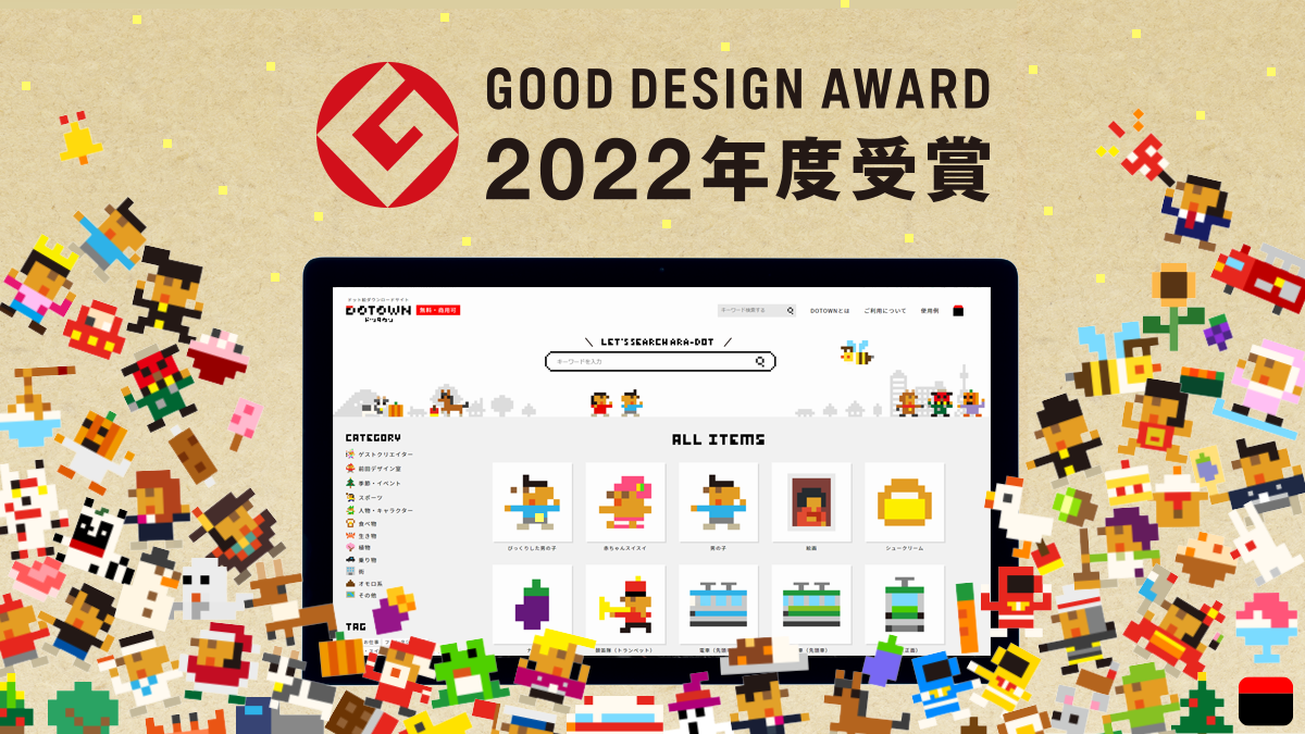 株式会社NASU(本社:大阪市中央区)代表の前田高志が運営するクリエイター集団「前田デザイン室」が提供する、素材ダウンロードサイト「DOTOWN(ドッタウン)」が2022年度グッドデザイン賞(主催:公益財団法人日本デザイン振興会)を受賞しました。粗ドット素材は、誰でも無料でダウンロード可能、商用としてもご利用いただけます。ダウンロードは、こちらから:https://dotown.maeda-design-room.net/
