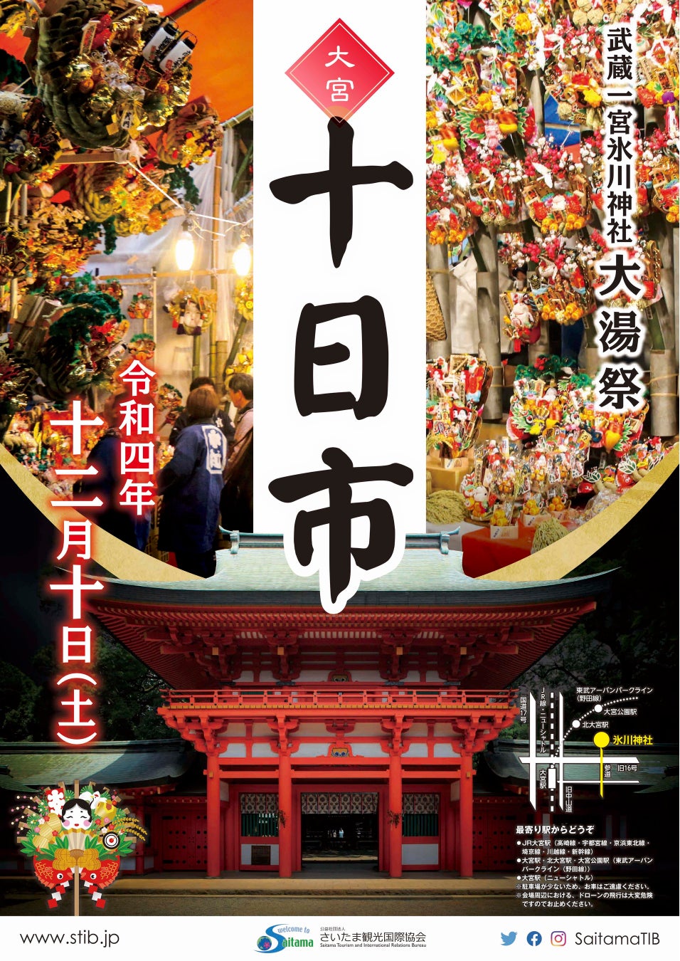 毎年12月10日に武蔵一宮氷川神社で開催される十日市は、氷川神社の神事「大湯祭(だいとうさい)」に合わせて行われる「酉の市」です。