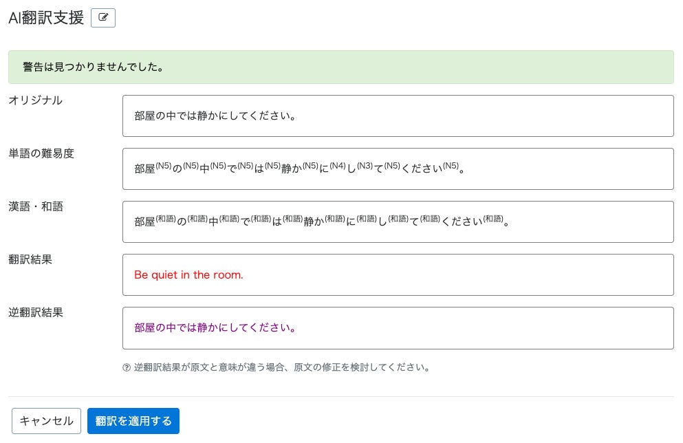 日本語の原文を翻訳する前に、AI翻訳が苦手とする構文やテキストを事前に示して修正を促す機能を追加しました。