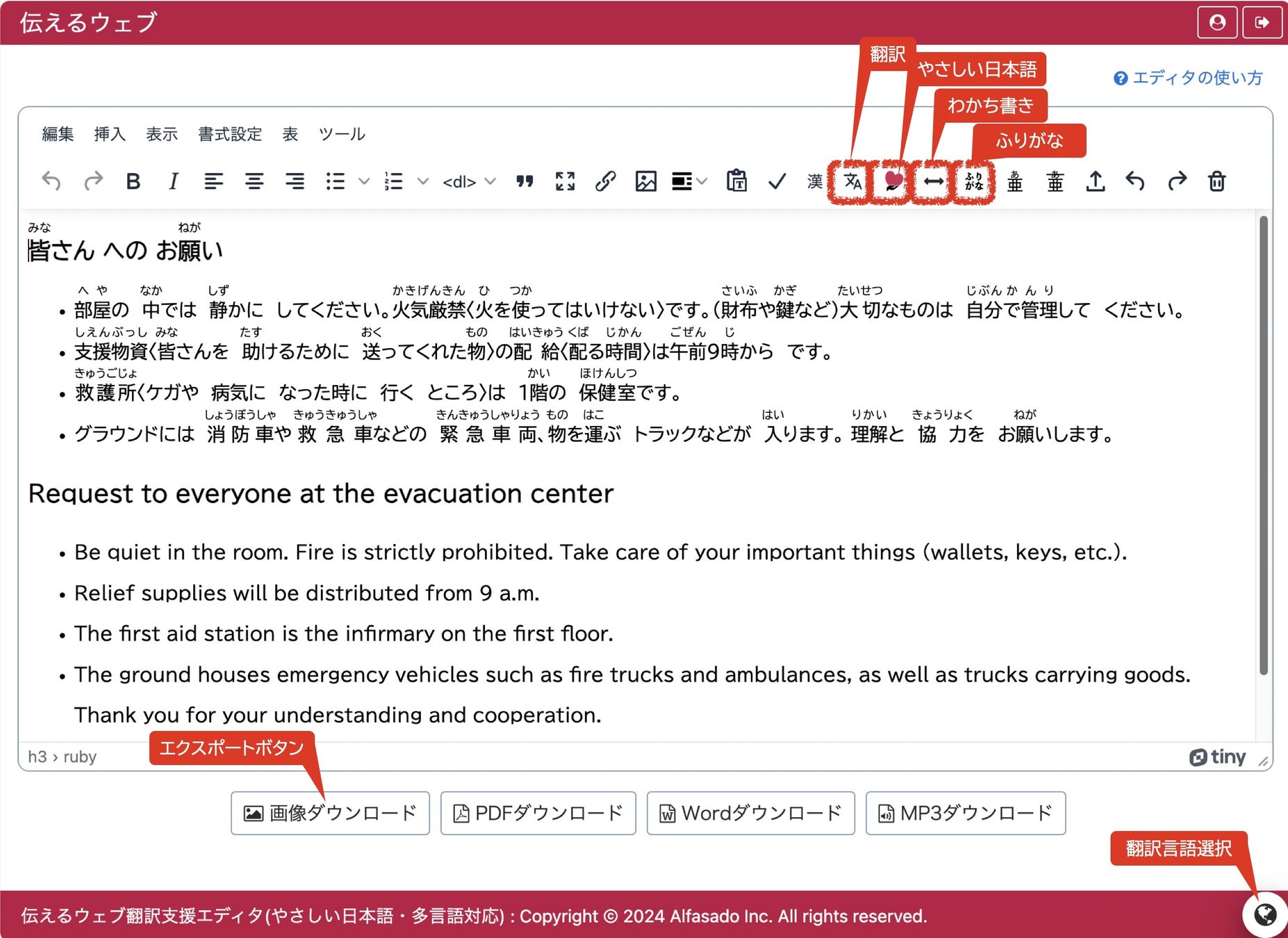 【令和6年能登半島地震に対する支援】やさしい日本語への言い換え、英語・中国語・韓国語・ベトナム語など70言語以上に対応した多言語翻訳の機能がついたエディタを無償で利用できるようにしました。