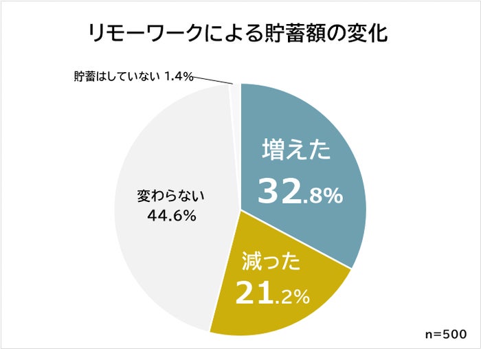 また、リモートワークにより、貯蓄額が増えた人は32.8%、減った人は21.2%で、リモートワークにより貯蓄額が変化した人は半数以上となりました。