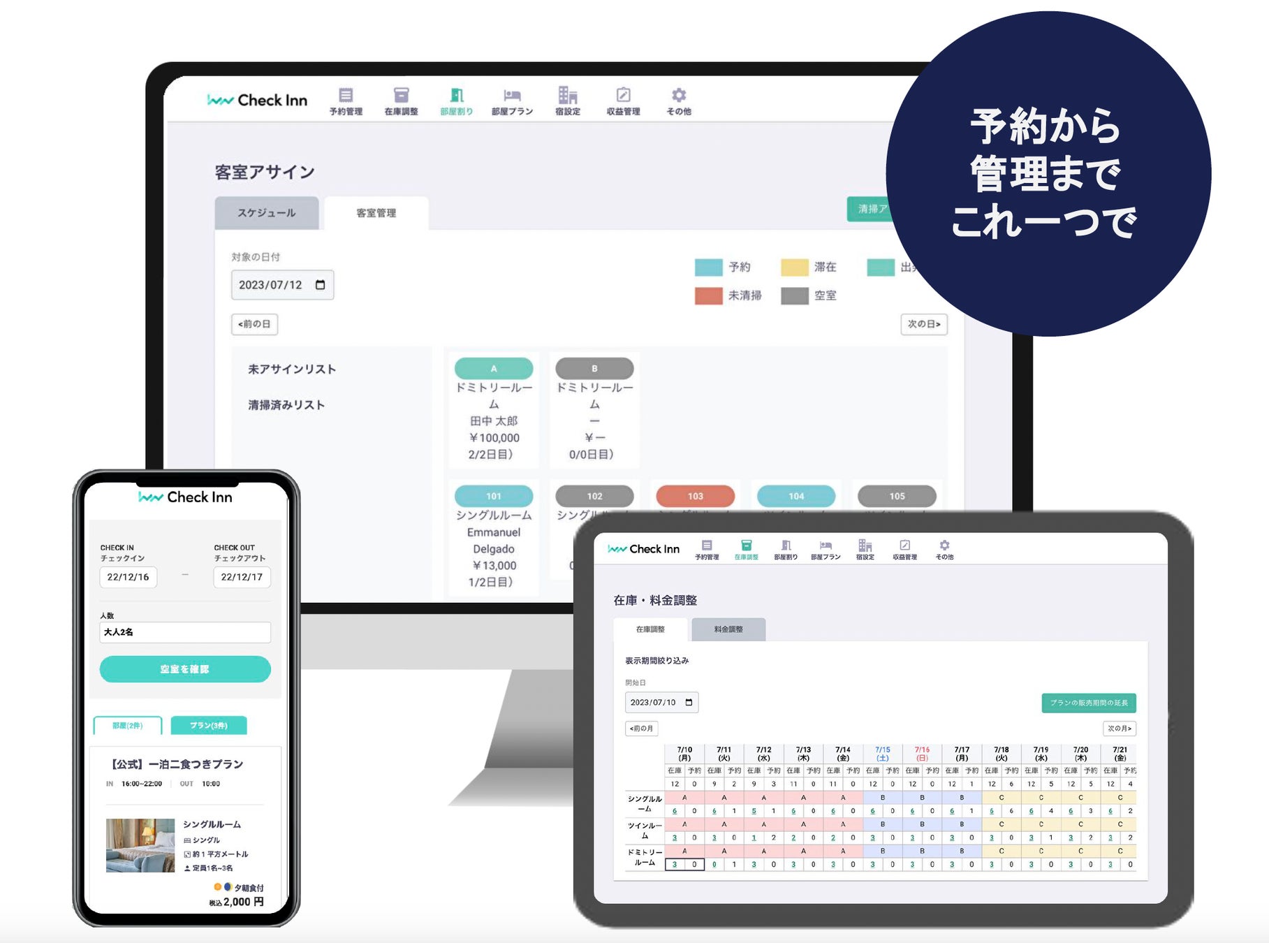 Check Innは、宿泊施設向けに設計されたクラウド型PMSで、予約・宿泊・料金管理から顧客対応まで一元管理が可能なオールインワンシステムです。「在庫や料金の自動調整」「売上管理」「客室アサイン」「顧客管理」など、使用するツールを一つにまとめることで、システム契約の手間やコスト・管理にかかる労力の削減に繋げます。民泊、簡易宿所、ホテルなど幅広い施設で導入されており、直感的なUIと豊富な機能が特徴です。