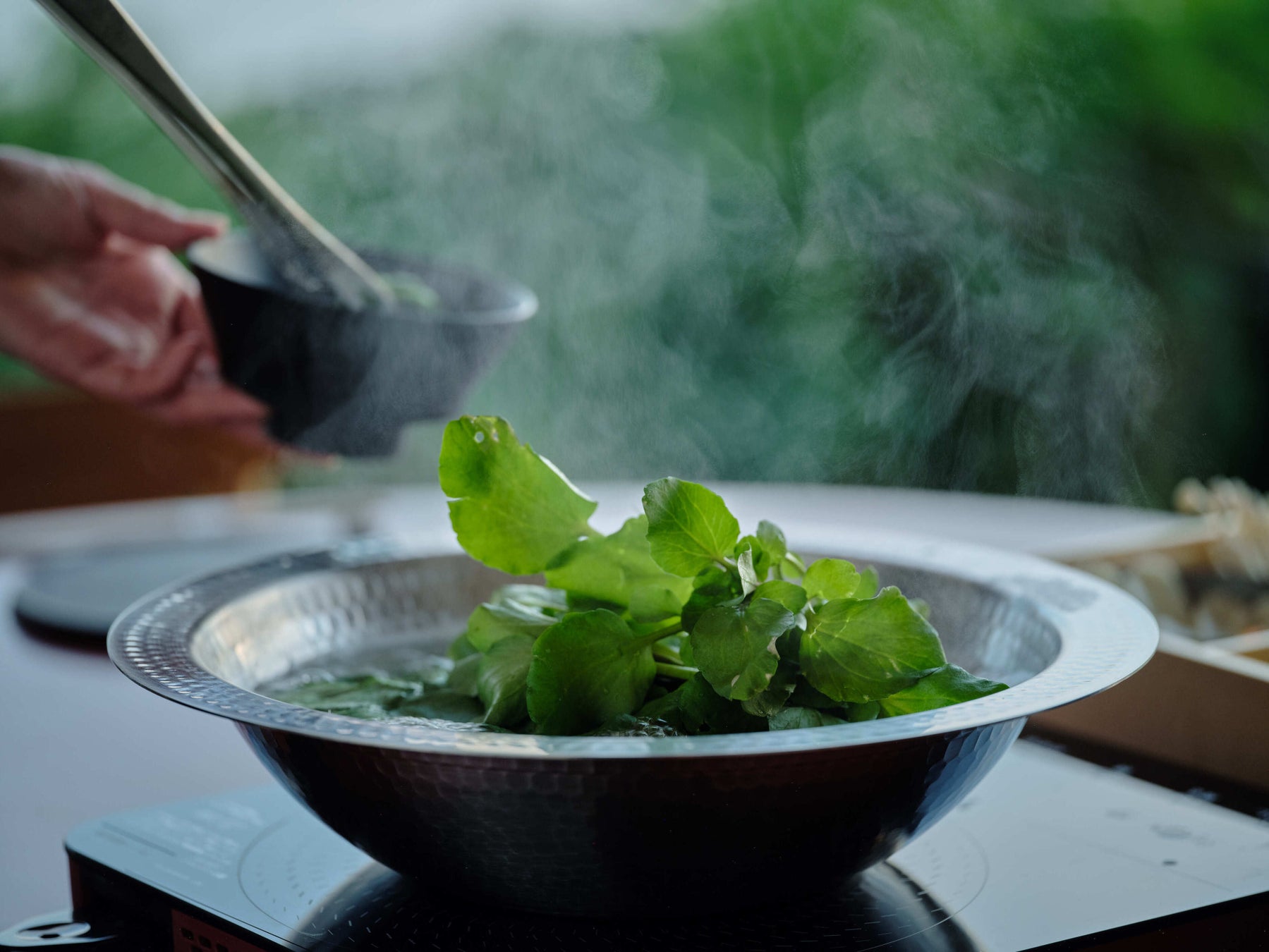 お食事は客室にお届けいたします。夕食3種類と朝食3種類からお選びいただき、各客室の屋外ダイニングテラスでお召し上がりください。プライベートな空間でありながらも、海を眺め、心地よい風を感じながら過ごす開放的な空間でのお食事のひと時をお過ごしください。