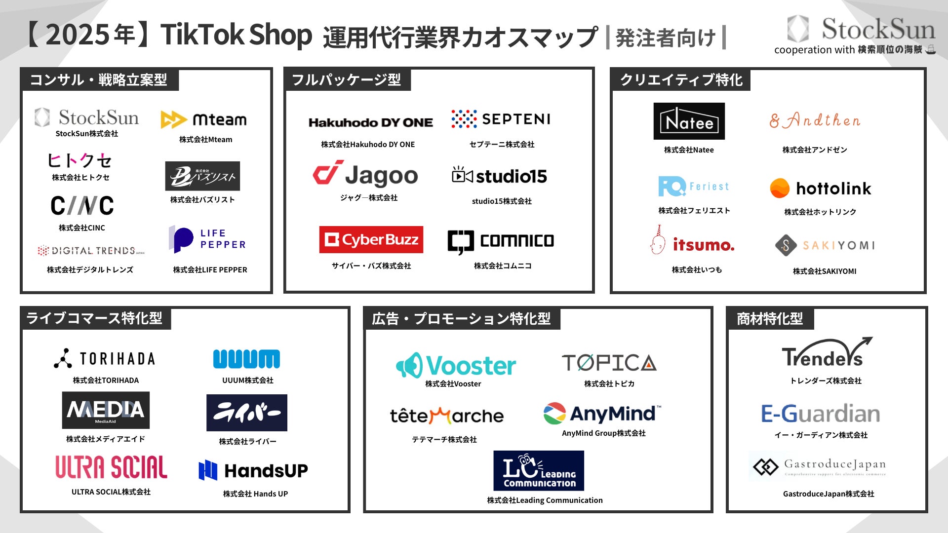 そこでStockSunは、TikTok Shop支援企業の全体像を可視化し、目的に応じたパートナー選定をスムーズにするための包括的なカオスマップを作成しました。