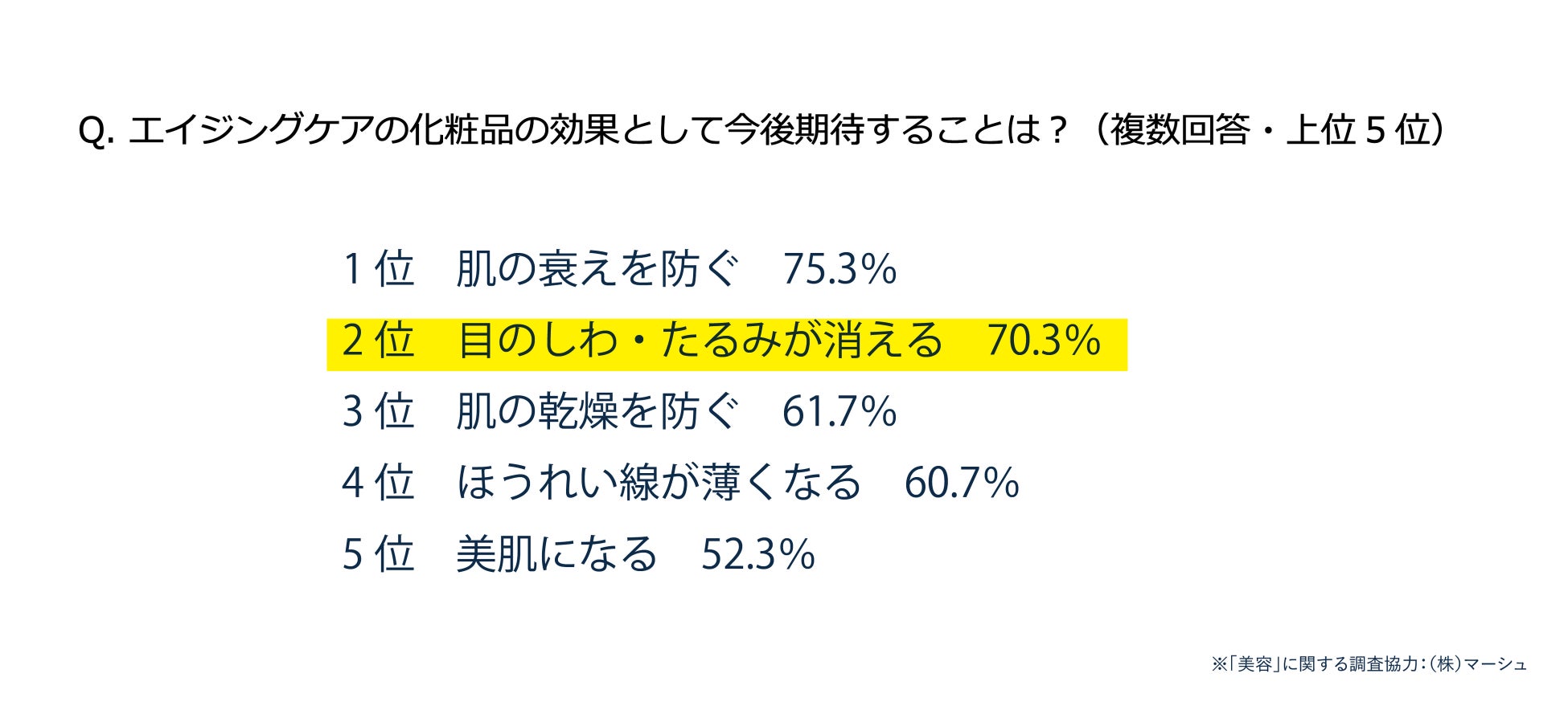 「エイジングケアの化粧品の効果として期待すること」として、2位に「目のしわ・たるみが消える」が挙がり、全体の7割を超えています。しかしながら、7割近くの人が既存のケア方法に悩みがあると回答していることから、エイジングケアとして目元ケアへの成果の期待が大きいものの、満足するケア方法が見つかっていない傾向にあることがわかります。