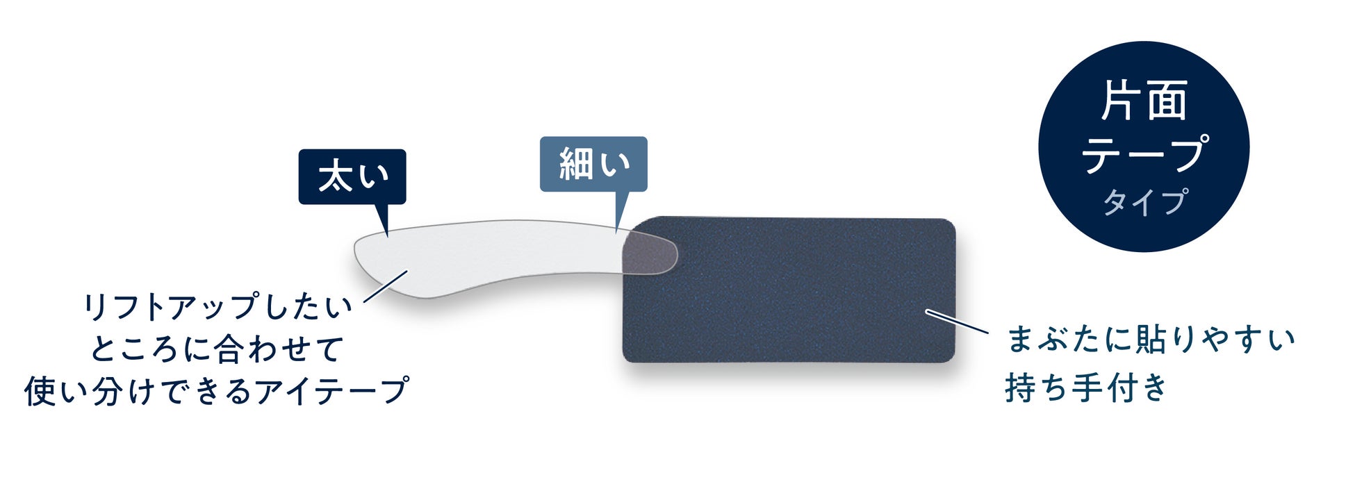 太いところと細いところのある独特なテープ形状。よりしっかりと持ち上げたい部分に太いところがくるように向きを合わせて貼ることができます。また、テープの台紙を切り取って、持ち手として使用できるため、ピンセットなどを使わずに、手軽にご使用いただけます。