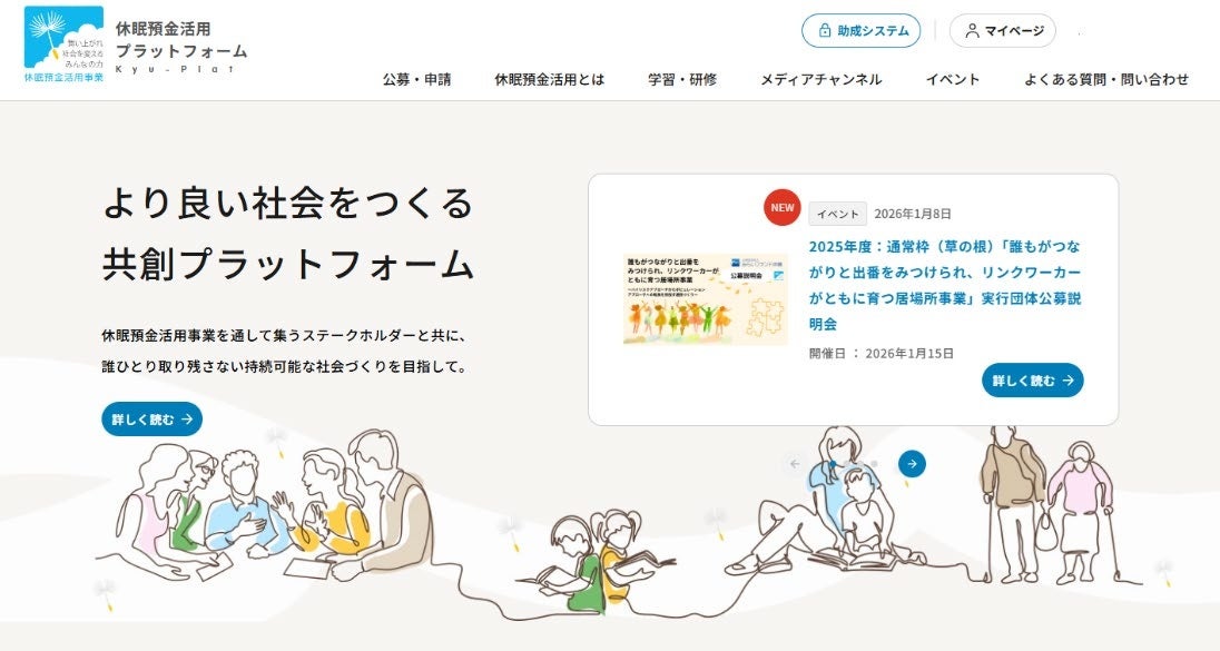 休眠預金活用プラットフォーム(https://www.kyuplat.com/)は、休眠預金等活用制度の仕組みや事業概要、採択事業の紹介、関連情報などを集約し、広く社会に発信する情報プラットフォームです。