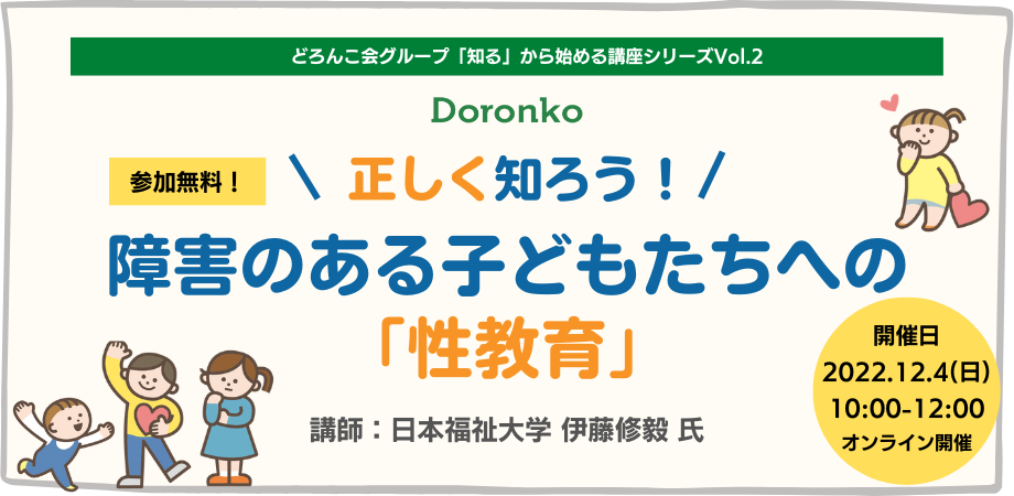 どろんこ会グループ(本社:東京都渋谷区)は2022年12月4日(日)に、日本福祉大学の伊藤修毅准教授をお迎えし、「正しく知ろう! 障害のある子どもたちへの性教育」講座をオンラインで開催します。参加費無料です。多くの方々のご参加を心よりお待ち申し上げております。