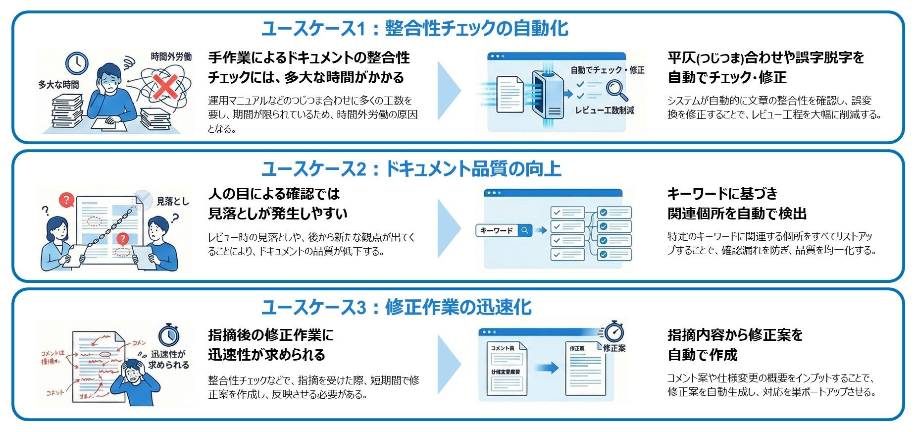 機密情報を含む各種データを外部に一切送信しないローカルLLMを金融システムの開発に活用可能かを検証するため、想定される「整合性チェックの自動化」「ドキュメント品質の向上」「修正作業の迅速化」の3つのユースケースを定義しました。