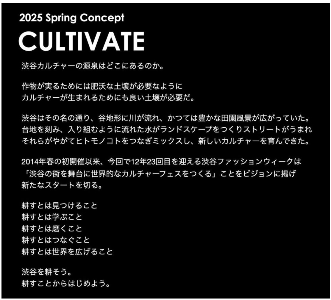 本イベントは2014年3月の初開催以来、毎年春と秋の開催を重ね、今回で12年目・23回の開催を迎えます。今春は「渋谷ファッションウィーク」が街を舞台に進化する第一歩と位置付け、コンセプトをカルチャーと同じ語源を持つ「CULTIVATE」に決定。ロゴも刷新します。初回開催以降、初の試みとなる渋谷の街全体を舞台としたカルチャーフェスを始動、アーティストコラボレーションによるシティドレッシングや大型商業施設、路面店舗と共創する特別なショッピング体験、休館中(オーチャードホールを除く)のBunkamuraでのアート展示など、多様な企画を展開します。