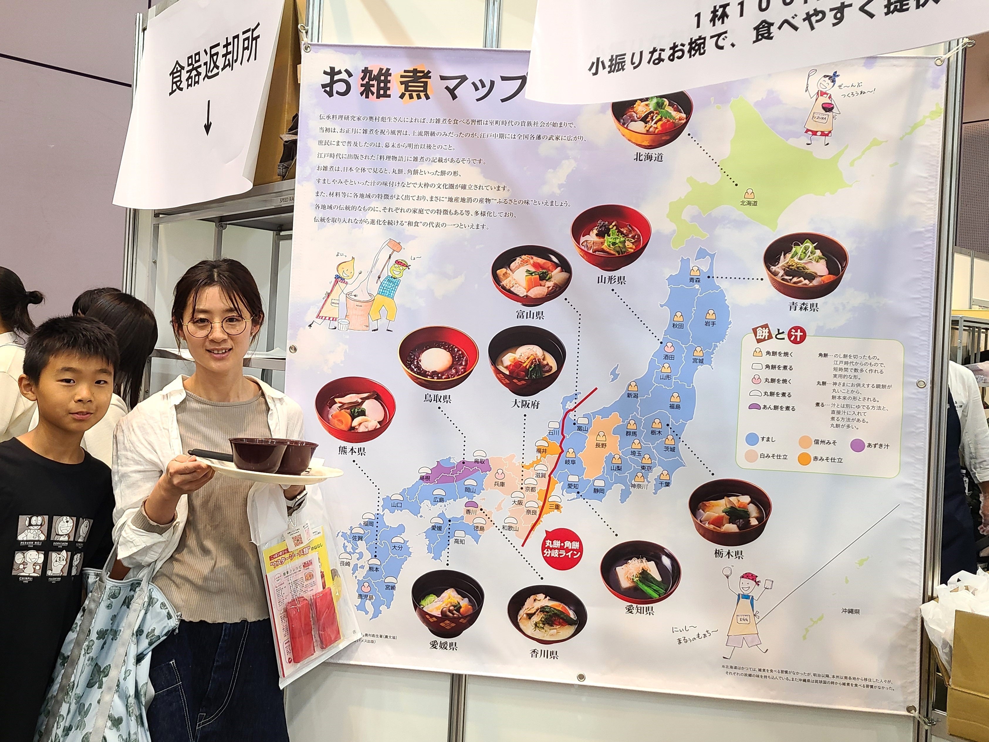 調理師学校が調理した、地域色豊かな4府県(青森県・大阪府・徳島県・熊本県)の伝統雑煮(各200食)を販売しました。また、雑煮のレシピを掲載した「お雑煮パネル」を掲示し、地域ごとの雑煮の特徴・傾向を日本地図上に分布した「日本列島お雑煮マップ」を展示しました。