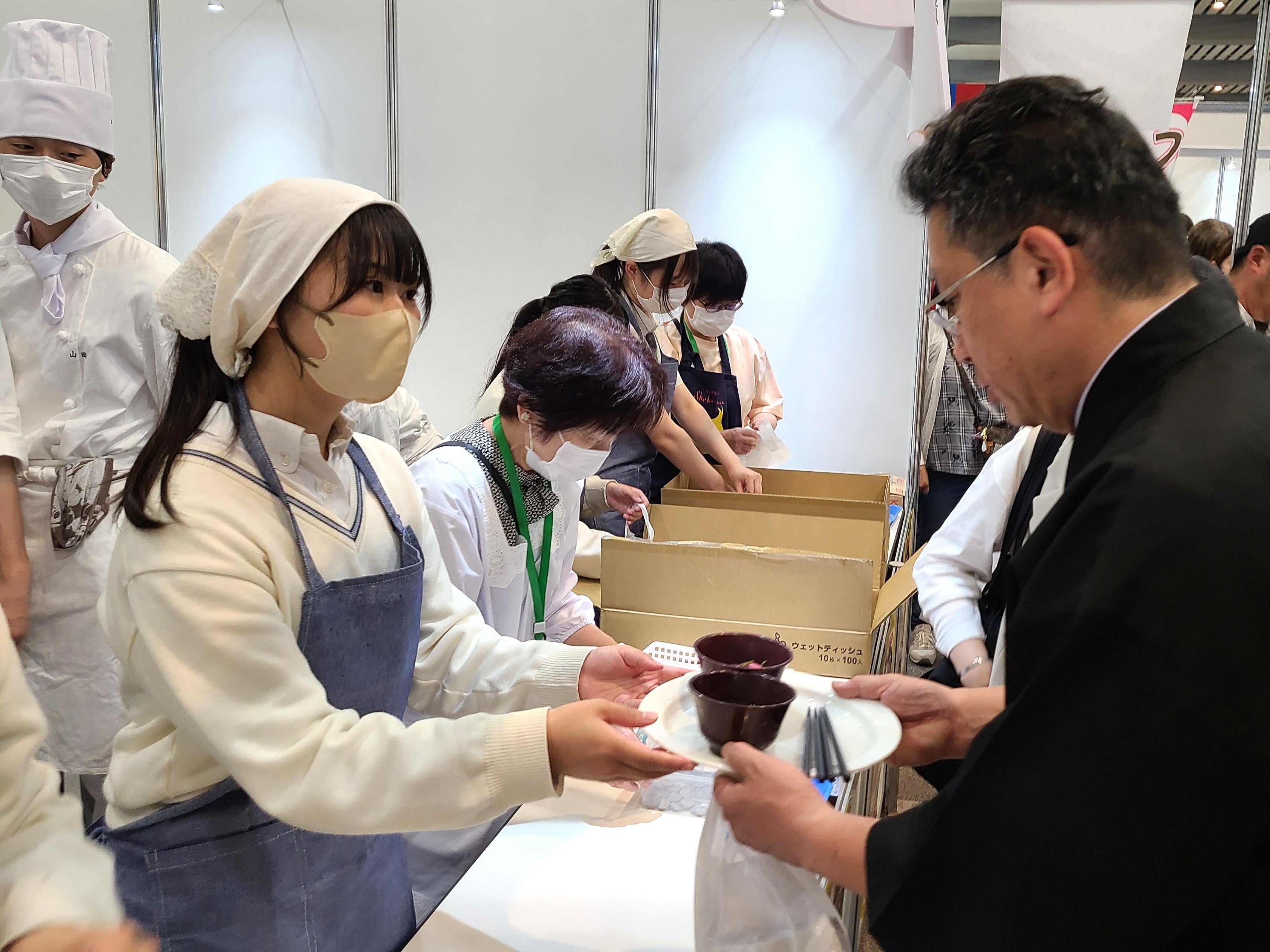 全国の小・中学生、高校生から寄せられたオリジナル雑煮レシピ1,107作品のうち、最終審査に残った2作品を調理師学校の学生・教員が調理し、500セット限定で来場者に販売しました。