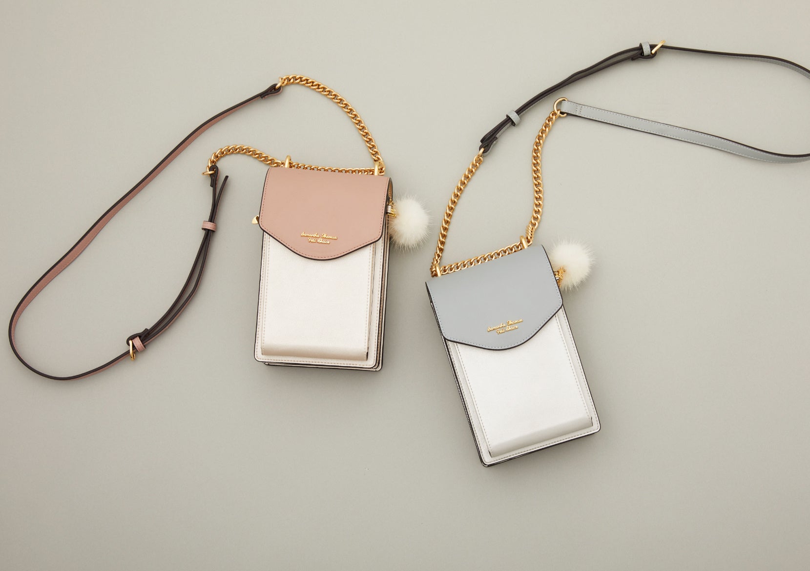 人気シリーズのプリーツデザインスマホショルダー。ホリデー限定カラーとして、ピンクとライトブルーが登場しました。スマホはもちろん、リップやハンカチなども収納可能。ファーのチャームがセットになった、ホリデーシーズンしか手に入らない特別感のあるシリーズです。