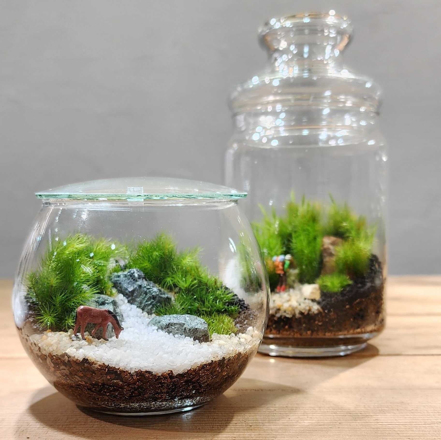 瓶、用土、苔、に加えて、動物、人物、石、砂などのパーツを自由に組み合わせて作れる苔テラリウム。世界に1つだけの「箱庭」は、日々の生活に癒しを与えてくれます。