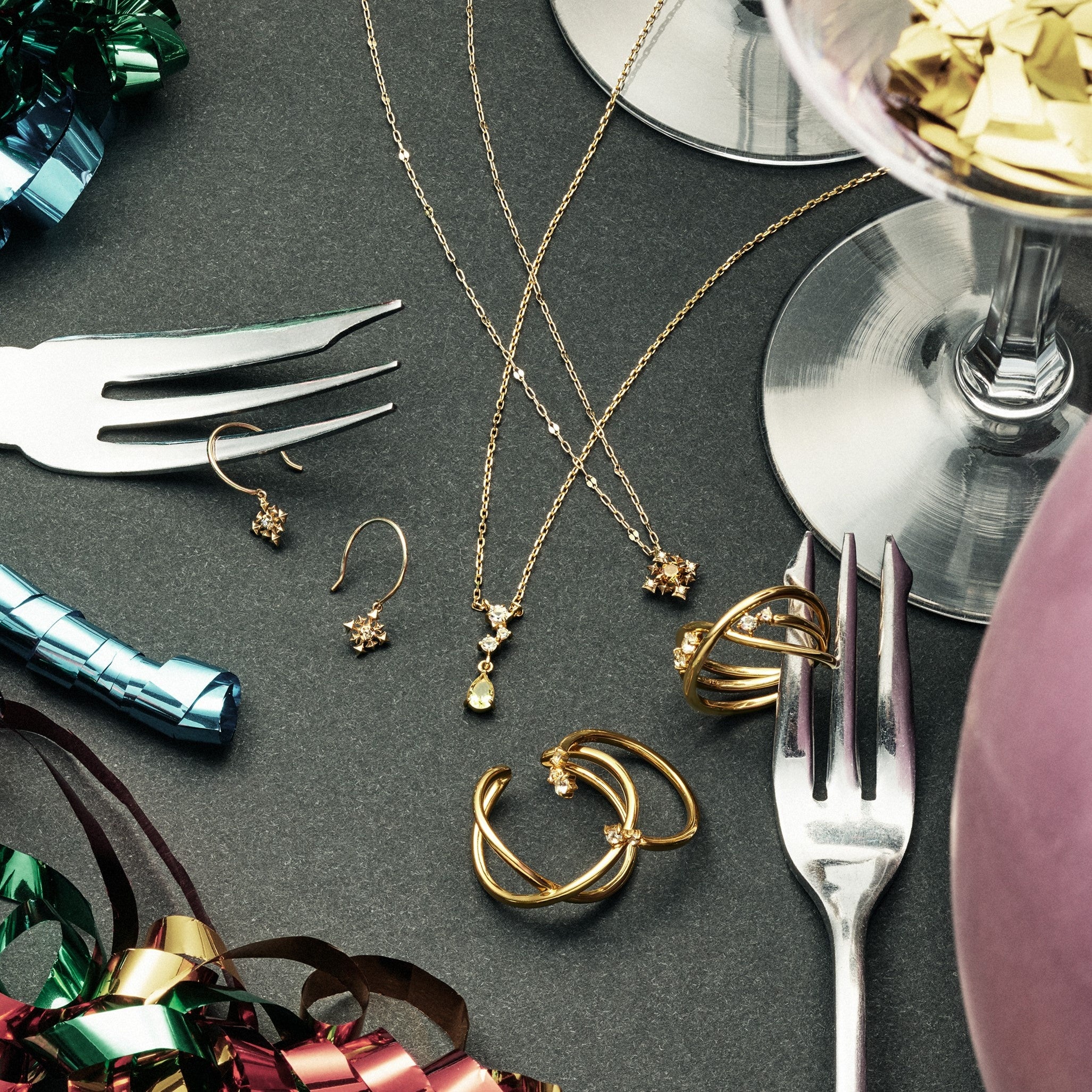 シャンパンの泡がはじける様子からインスピレーションを受けた数量限定シリーズ。チェインの煌めきや、こだわりの石留とテクスチャーが魅力。リングは3Way仕様です。プレゼントにふさわしい上品なデザインで、限定BOXが付いています。
