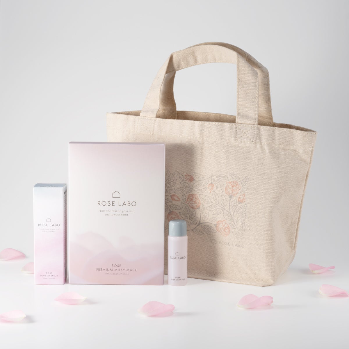 今冬新発売のローズプレミアムミルキーマスクが入ったスキンケアセット。自社農園で無農薬栽培した「食べられるバラ」のエキスがふんだんに使用された敏感肌でも使える無添加製品です。バラの香りに包まれながら、整った素肌へと導いてくれます。