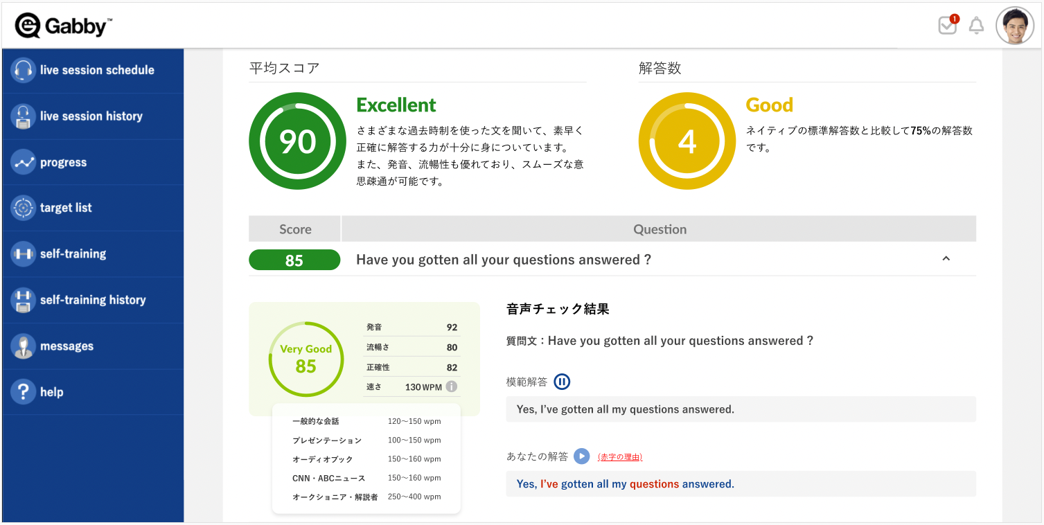 毎日のセルフ・トレーニングメニューを完了したユーザは、その日にトレーニングを行ったレベルの習熟度確認を自主的に行うため、CHIVOX®︎を組み込んだミニテスト(ラストラン)に挑戦します。発音、流暢性、正確性、文法、話すスピードなどGabbyがコンセプトとする「実践的な話す英語」を習得するための評価基準においてユーザの解答を自動評価し、トレーニングの成果として記録します。