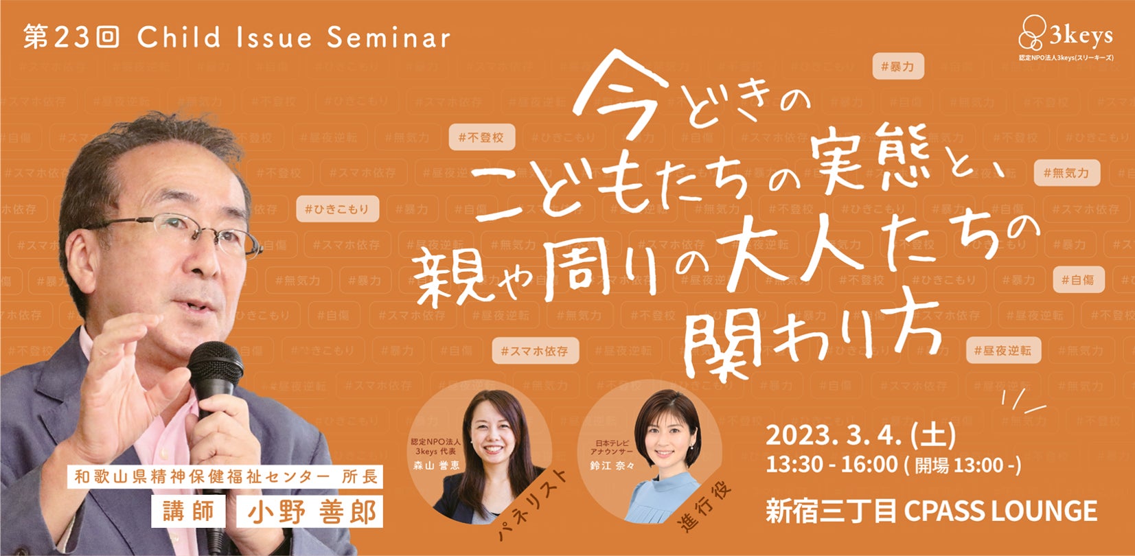 認定NPO法人3keys(東京都新宿区、代表理事:森山誉恵)は、どんな環境で生まれ育っても十分な教育や愛情が受けられる、すなわちすべての子どもの権利が保障される社会に向けて、様々な活動をしています。「Child Issue Seminar」は、子どもたちを取り巻く社会の現状や課題を多くの方に伝え、ともに考えるためのセミナーです。コロナ禍により実施を見送ってきましたが、このたび、およそ3年ぶりに開催することとなりました。