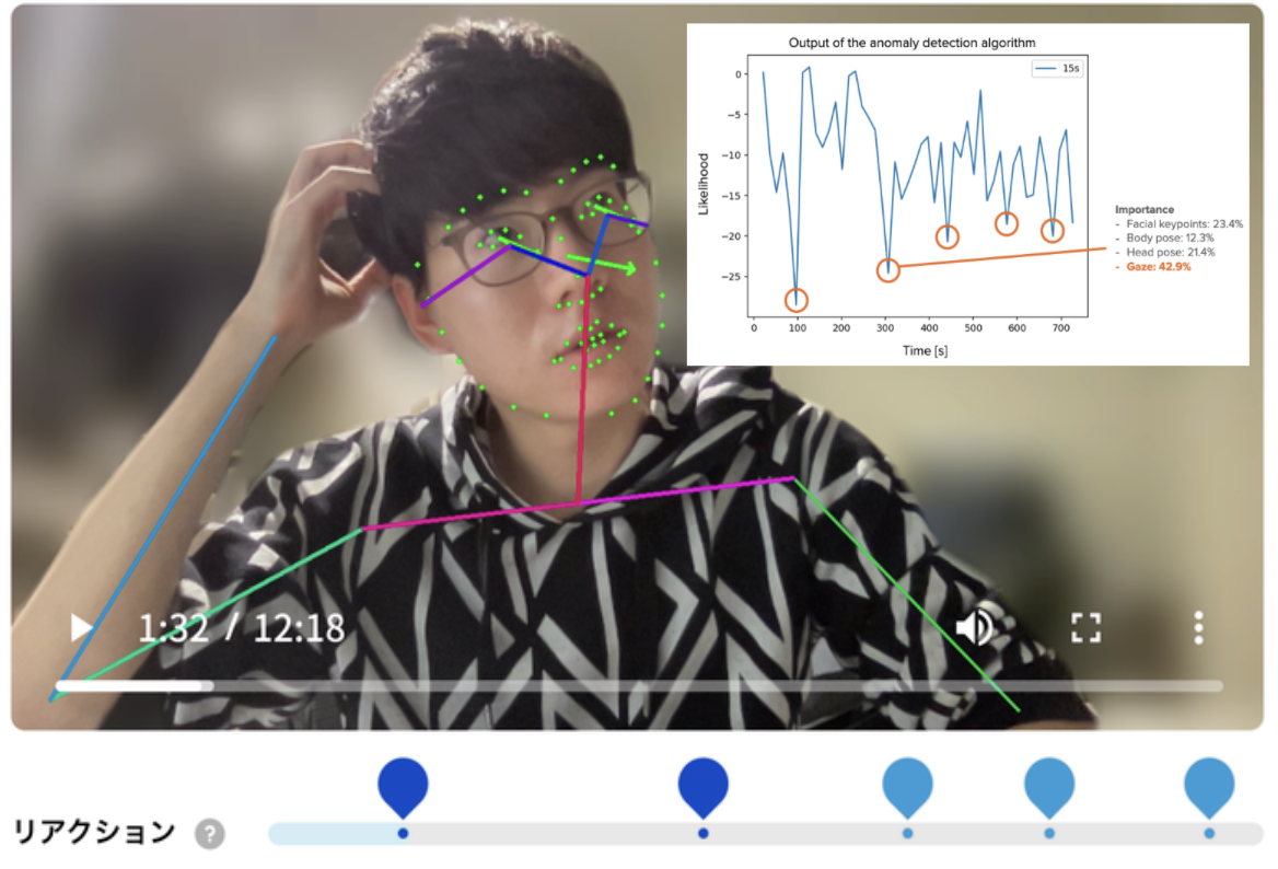 人材アセスメントは被評価者の発言や挙動の機微を読み取ることが求められることに加え、人事考課にも結びつくものである点から、AI技術の導入は進んでいませんでした。本研究では、評価の過程のブラックボックス化を招くことなく、アセスメント業務を効率化するためのAI技術を提案しました。Amershi [1]らによると人とAIが協働する際には、人とAIの間のTrust(信頼関係)が大切だと提唱されています。「表情、姿勢、頭の傾き、視線」といったマルチモーダルな行動特徴の自動センシングと異常検知アルゴリズムを組み合わせることで、人材評価者による解釈性や説明可能性を持たせ、プロのアセッサーがAIを使うときのTrustを担保しました。今後も①データの蓄積を通じAIの精度をあげる② より質の高いAIのサポートを受けることで人の能力を向上させる③より質の高いデータをAIにFBする、という正のループを回すことでAIと人の協同を目指します。
