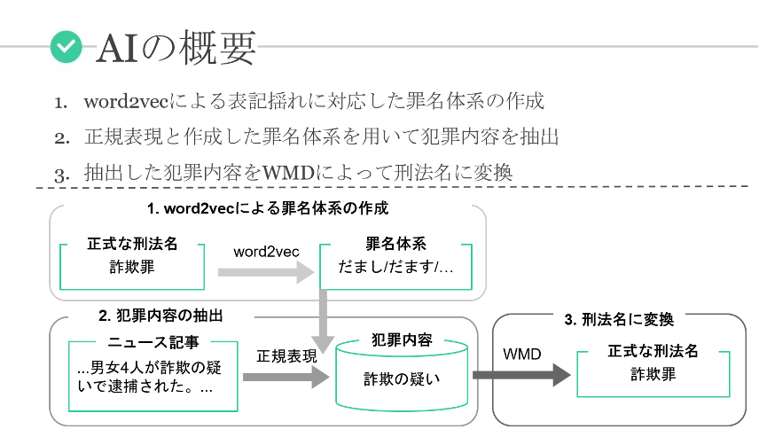 これまでの共同研究開発の結果,犯罪情報を体系化し自動でデータベース化するAIエンジンの開発に成功しました。
