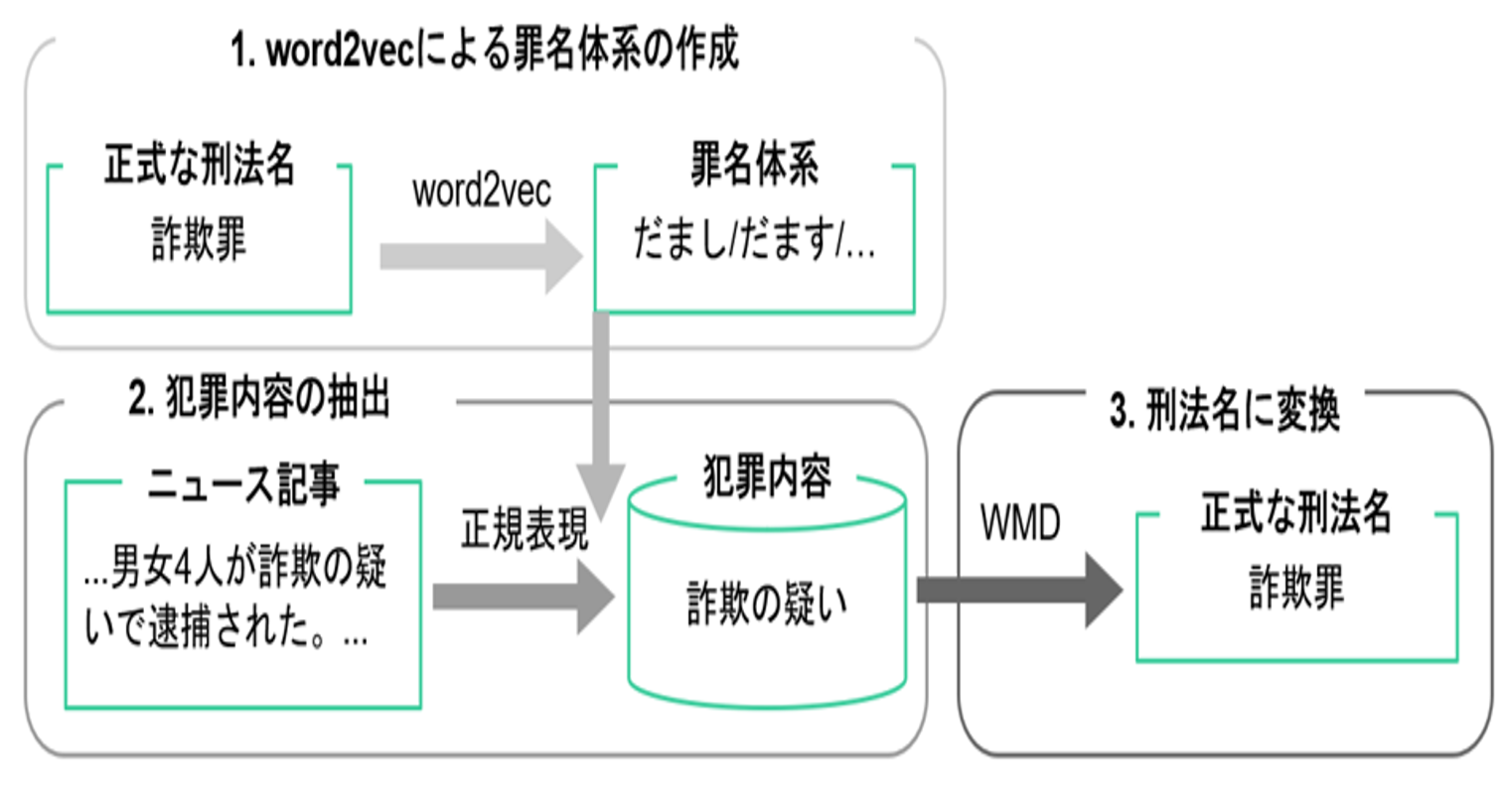 このAI技術は企業犯罪記事を収集したうえで犯罪、事件、事故に関連する記事からその内容に関する文を抽出し、さらに刑法に定義された正確な罪名等でラベリング化するものです。この手法は「教師無し学習」という、AIにパターンを教え込むためのデータ(教師データといいます)が無くとも行える画期的なものになります。具体的には下図に示す通り、言葉の意味を読み取るAIであるWord2vecと文書同士の類似度をはかるWMDを組み合わせて罪名と記事中の文を対応付けてラベリングします。このAIにより手動で犯罪・リスク情報を収集する必要がなくなり自動で高速かつ大規模な犯罪・リスクデータベースを構築できます。