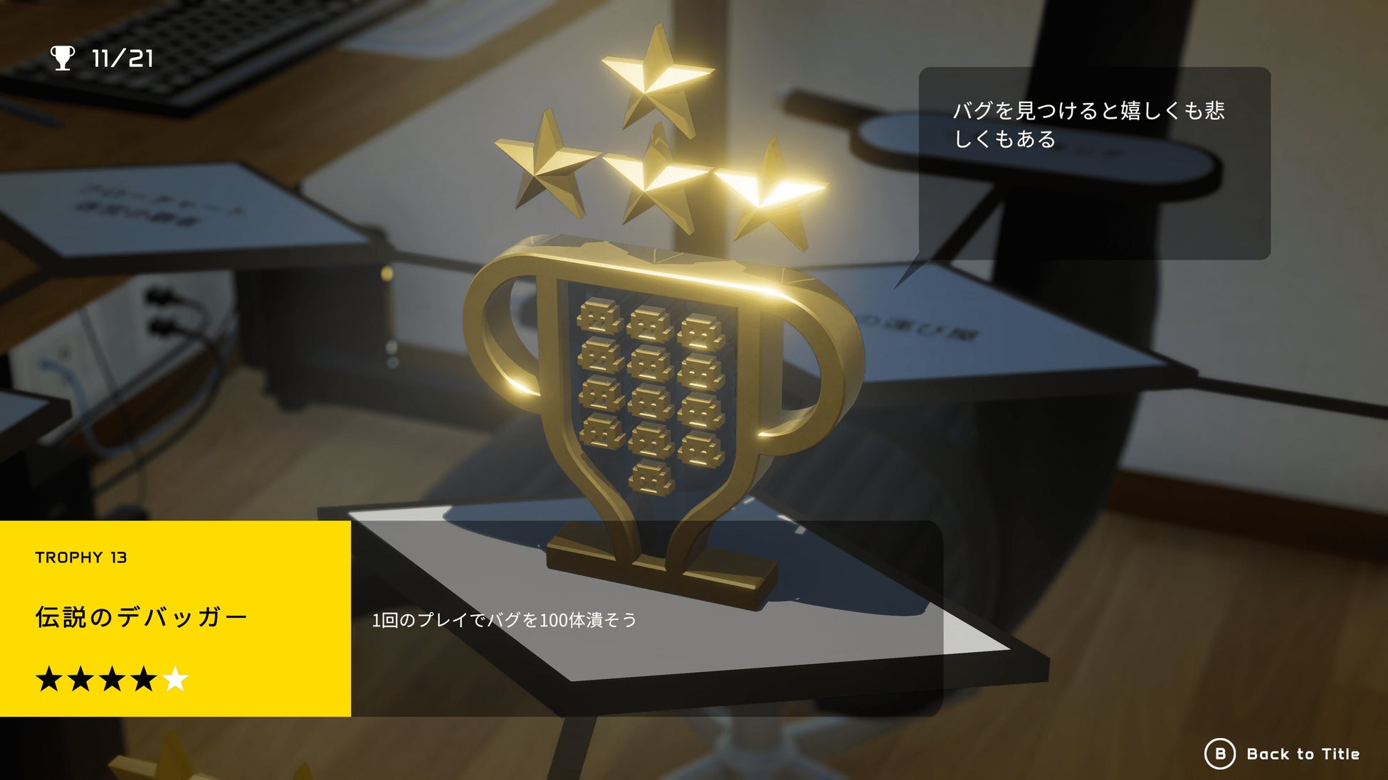 プレイする”フレーバー”を選んだら、ゲームはとあるクリエイターの家の冷蔵庫から始まります。部屋中を回転やジャンプしながら、冷えているうちにゲームクリエイターへカロリーメイト リキッドを届けることがミッションです。途中、飼い猫に攻撃されたり、PCの中から現実に拡張してきたバグと戦ったり、フローチャートのステージを登ったりと、様々な壁を乗り越えます。部屋内にはファミ通や積みプラ、ネーミング辞典など、“ゲームクリエイターあるある”も満載。ミッションをクリアして集めるトロフィーもあります。