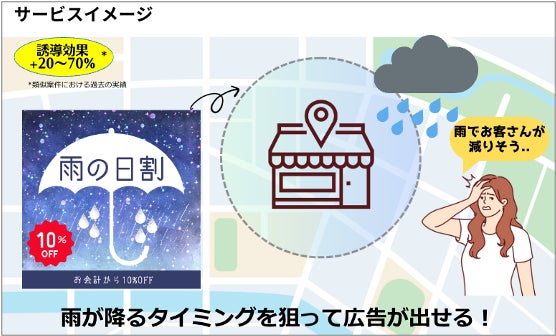 ルグランとジオロジックはこの課題を解決するために、ルグランは気象データをジオロジックは位置情報を提供し、新たなサービスを開発することで合意しました。このサービスを活用することで、例えば、店舗や施設の周辺で雨が降り来店や売上が減りそうなときに、広告主は雨の日サービスなどの広告に切り替えて、店舗周辺にいる人達に来店を促すことが可能になります。また、広告を受け取った人々は、自分が置かれている立場やニーズに合わせて配信された広告を「身近な情報」として受け入れ、行動変容を起こすことが想定されます。