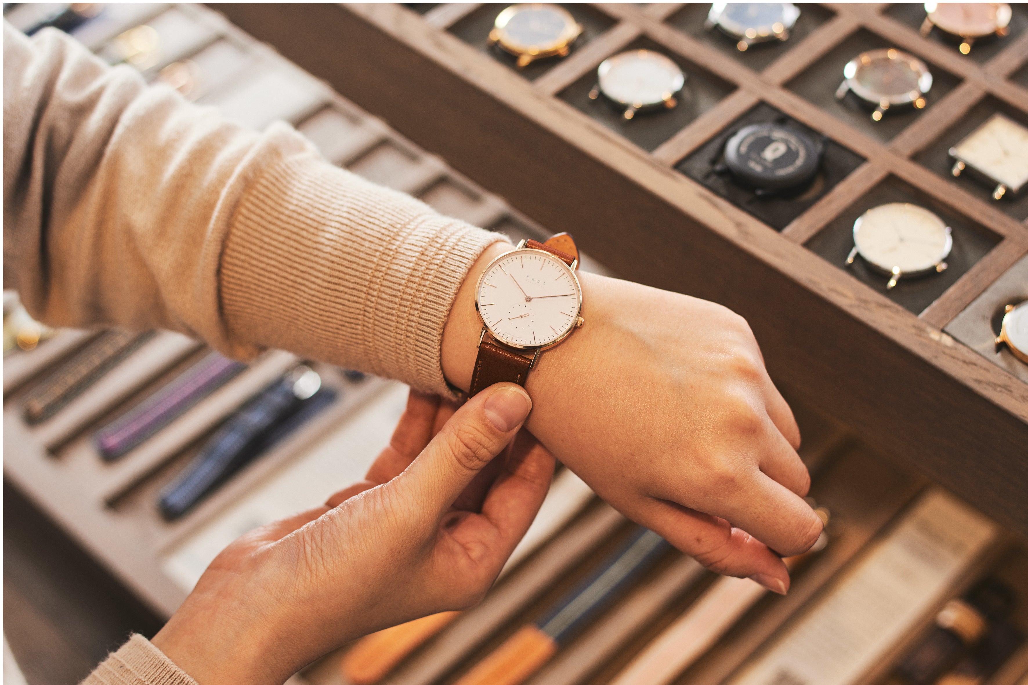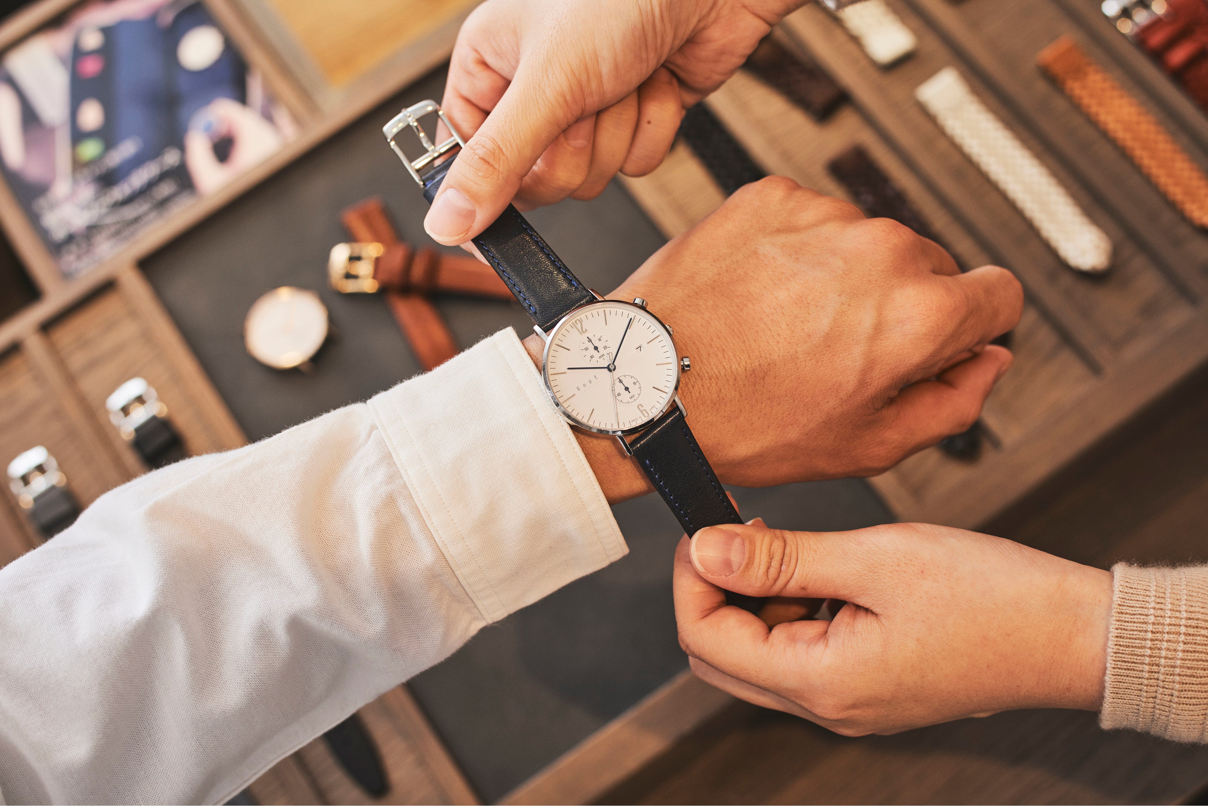 腕時計というと店頭ではガラスケースに入っていて、気軽に触れない・・・そんなイメージをお持ちの方も多いのではないでしょうか?Knot直営のギャラリーショップではテーブル一面にサンプルが並び、実際に時計とストラップを着け変えることができます。たくさんありすぎてどう選んだらいいか分からない・・そんな時はぜひ経験豊富なKnotのアドバイザーにお気軽にご相談ください!