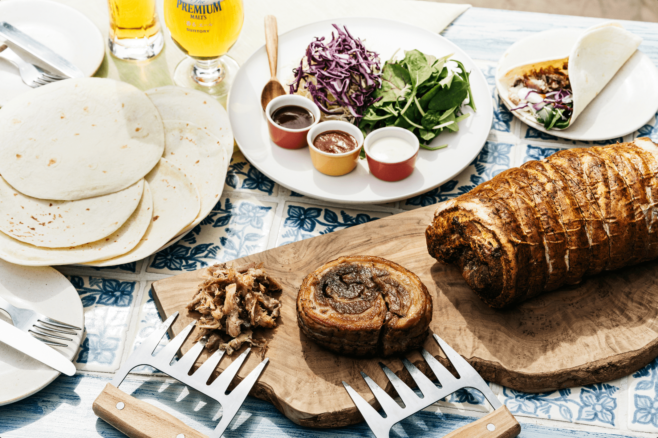 「二子玉川ライズ」の開放的な空間を活かした夏の風物詩として親しまれているプレミアムビアテラス。今年は、こんがり焼き上げた塊肉を引き裂いて食べる会場限定メニュー「プルドポーク パーティー」を目玉として打ち出し、青空の下みんなでシェアして楽しめることをコンセプトに「PREMIUM BEER TERRACE FUN GRILL & TO GO!」を2022年5月20日(金)から10月10日(月・祝)の期間限定でオープンします。