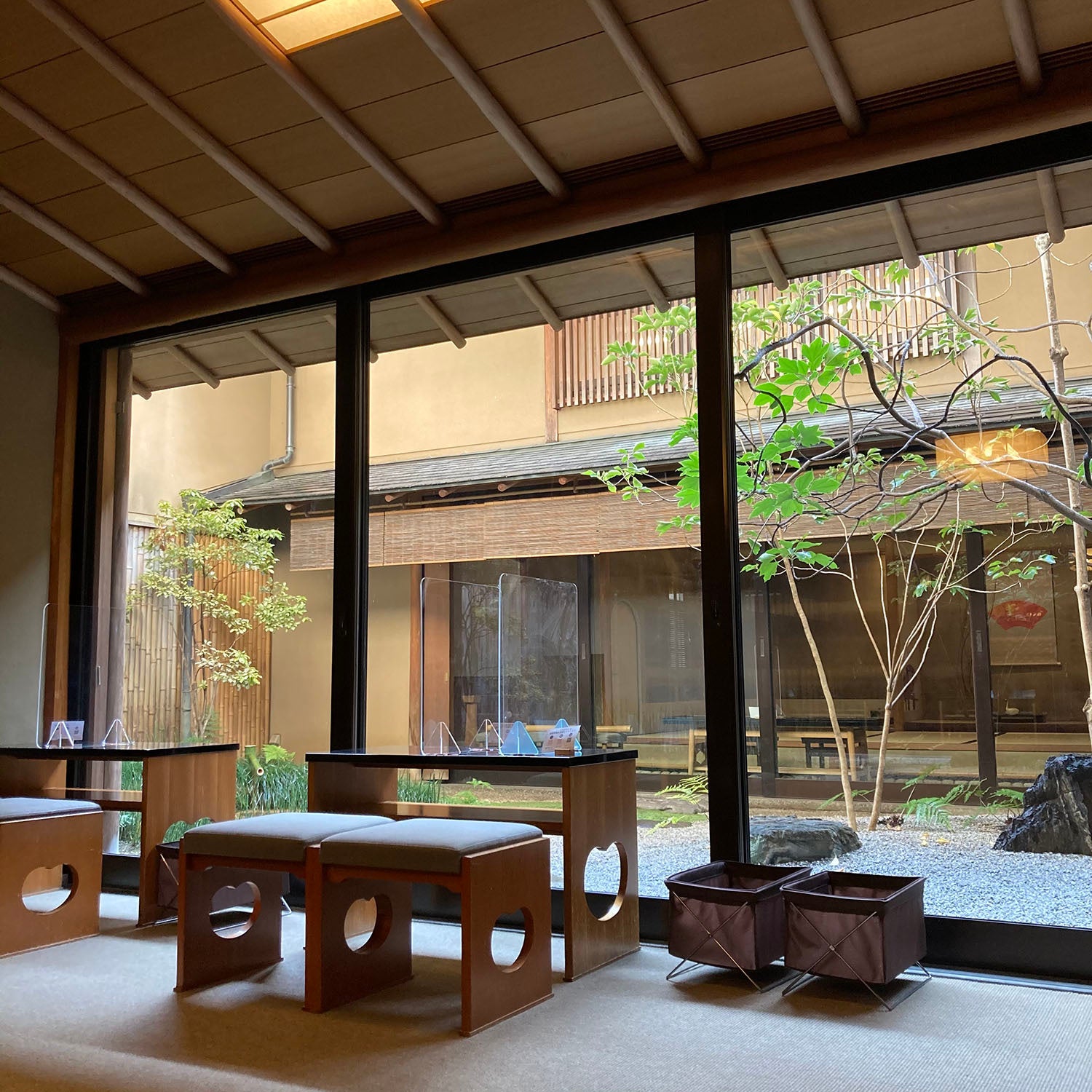 鶴屋吉信本店2階 お休み処にてテーブル席をご案内申し上げます。静かで落ち着いた空間には中央に茶庭、奥には茶室を構えており、建物内の2階とは思えないほど。