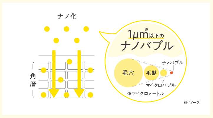 美容液には特殊ノズル、化粧水にはナノボールといった部材を採用。容器をシャカシャカとよく振ることで、毛穴よりもはるかに小さい1µm(マイクロメートル)以下の超微細なナノバブルが発生し、美容成分*³ を届け*⁵ 効果*⁴ をサポートします。