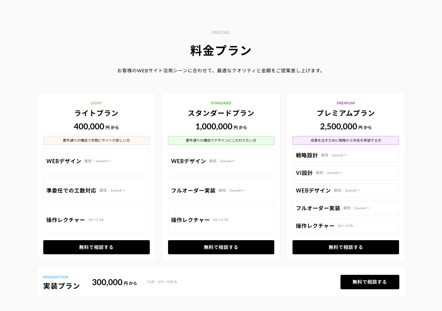 クライアントのフェーズに合わせたご提案ができるプランになっておりますので、Webサイト制作にお迷いの方はぜひお問い合わせください。