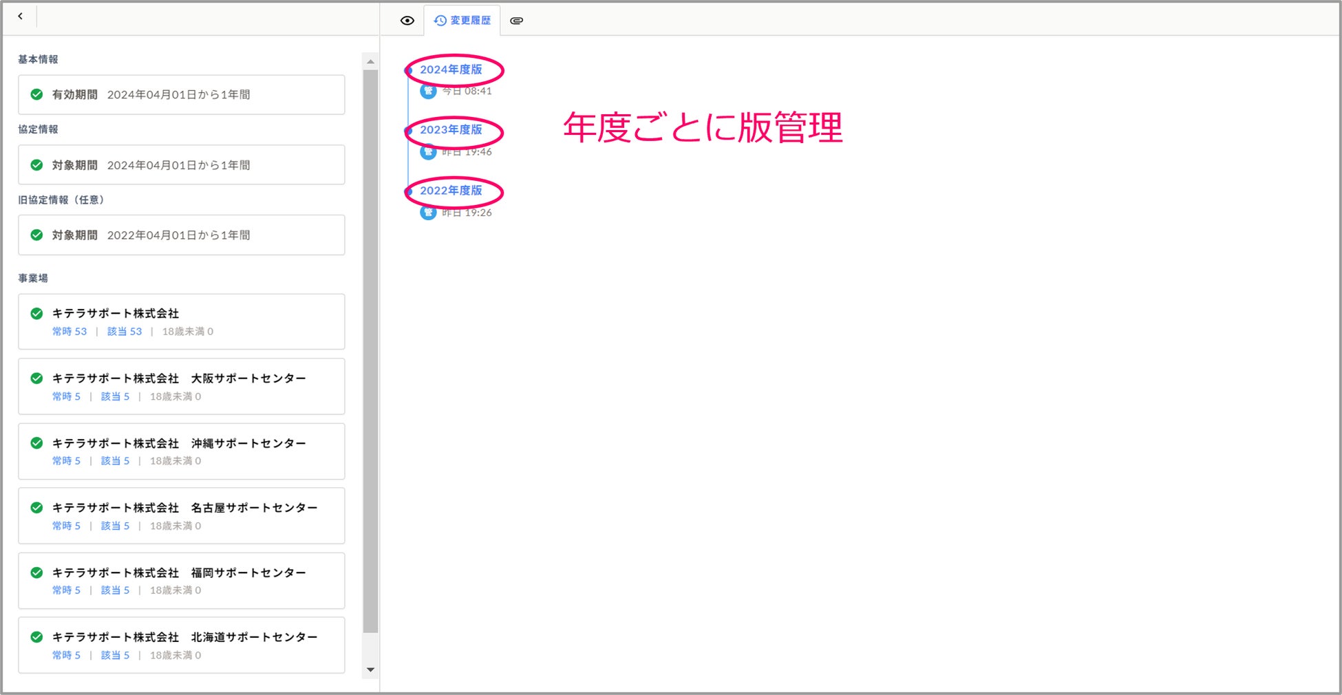 3.年度での版管理ができ、2回目以降は有効期間や労働者数等、変更部分のみ入力することで作成ができるため、業務効率が大幅にアップ