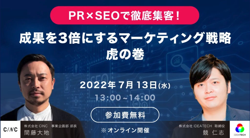 国内最速級のリサーチPR「リサピー®️」(https://research-pr.jp/)を提供する株式会社IDEATECH(本社:東京都港区、代表取締役:石川友夫)は、株式会社CINC(本社:東京都港区、代表取締役社長 石松 友典)と「成果を3倍にするマーケティング戦略 虎の巻」と題するセミナーを、2022年7月13日(水)13:00よりオンラインにて共同開催いたします。