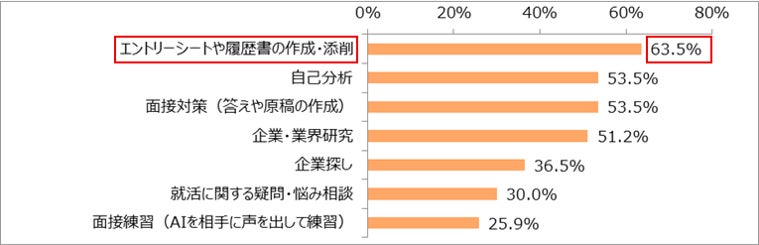 「エントリーシートや履歴書の作成・添削」(63.5%)が最多となり、次いで、「自己分析」(53.5%)、「面接対策(答えや原稿の作成)」(53.5%)、「企業・業界研究」(51.2%)がほぼ同率でした。