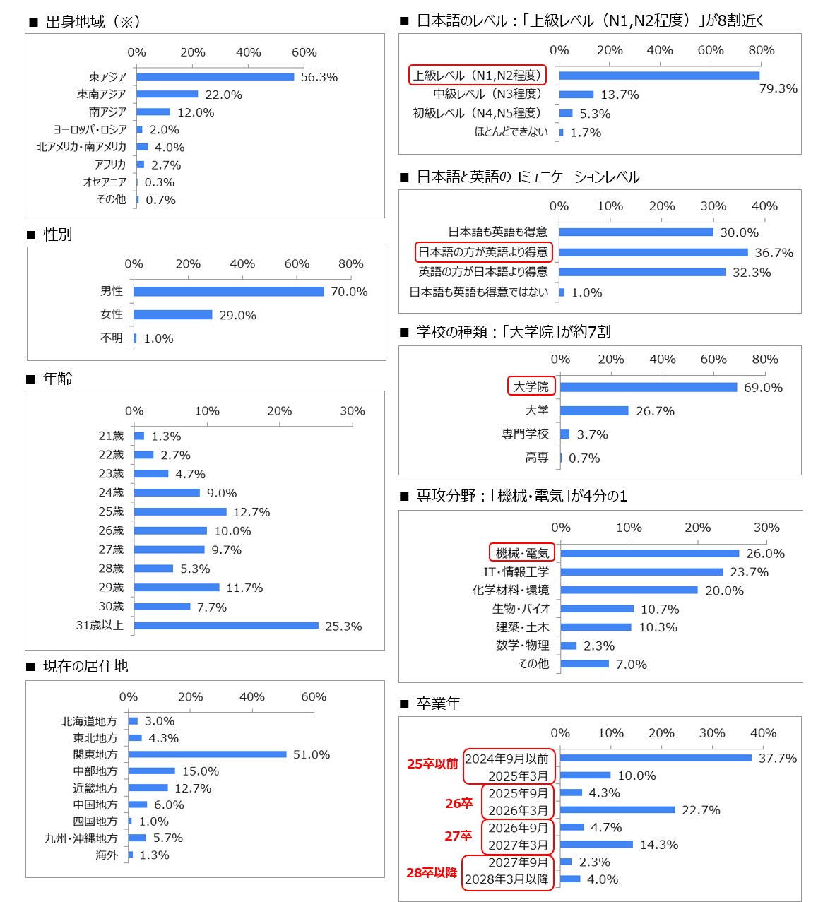 【回答者の属性】 『リュウカツ』登録者の特長である、高学歴で日本語レベルが高い理系留学生が多数