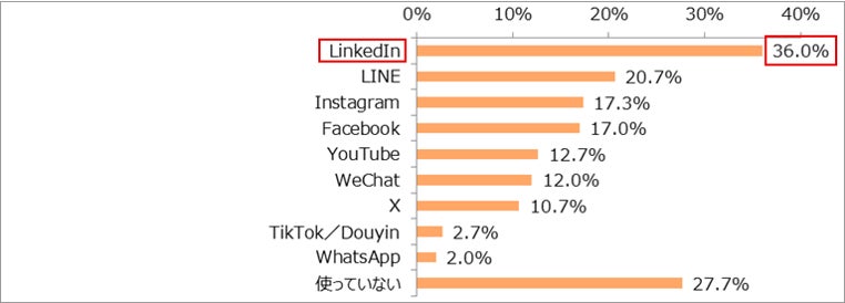 「LinkedIn」(36.0%)が最も多く、4割近くが回答。「LINE」(20.7%)、「Instagram」(17.3%)、「Facebook」(17.0%)も約2割となりました。その一方で、SNSを「使っていない」と回答した留学生も約3割(27.7%)いることがわかりました。
