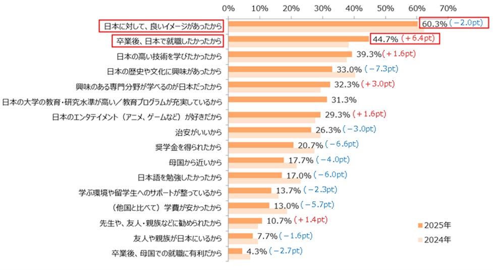 ● 日本に留学した理由、2位の「卒業後、日本で就職したかった」が前年比6.4pt増の44.7%に