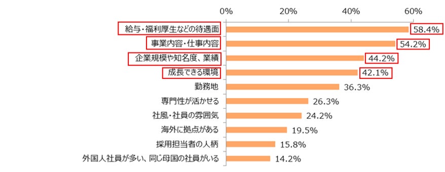 1位「給与・福利厚生などの待遇面」(58.4%)、2位「事業内容・仕事内容」(54.2%)、3位「企業規模や知名度、業績」(44.2%)という結果になりました。また、4位「成長できる環境」も4割(42.1%)を超え、留学生の成長意欲の高さがうかがえます。