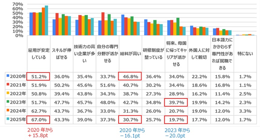 2020年に約5割(46.8%)だった「給料が高い」は16.1pt減少しました。また、「将来、母国に帰ってキャリアが活かせる」も2023年の39.7%をピークに減少しています。