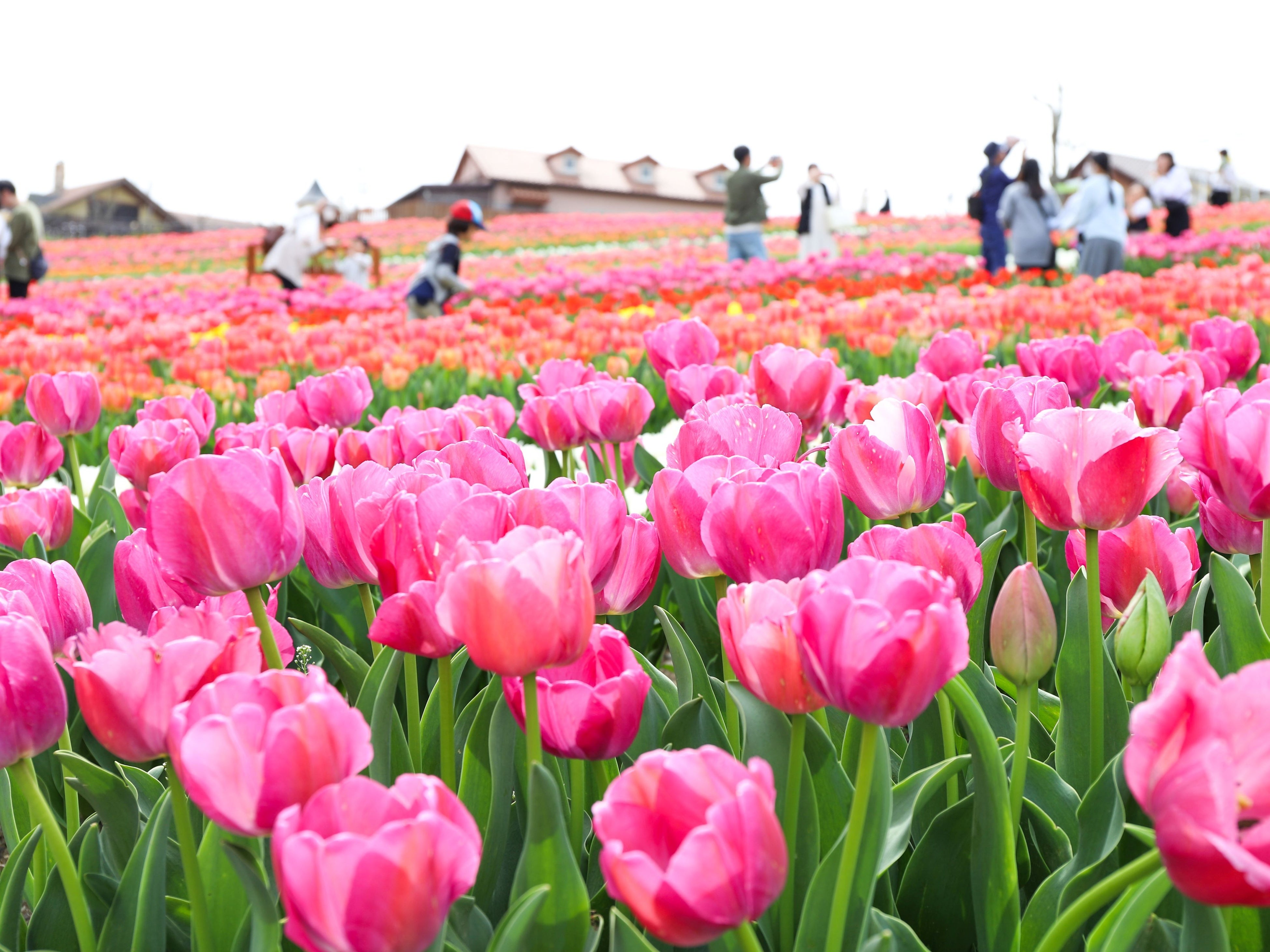 3,000㎡の広大な花畑一面に広がる色とりどりのチューリップ。規則正しく並びながらも風に揺れるたびに表情を変え、まるでおとぎ話のワンシーンのような風景が訪れる人々を魅了します。