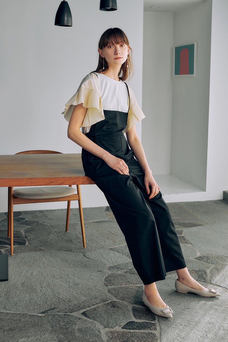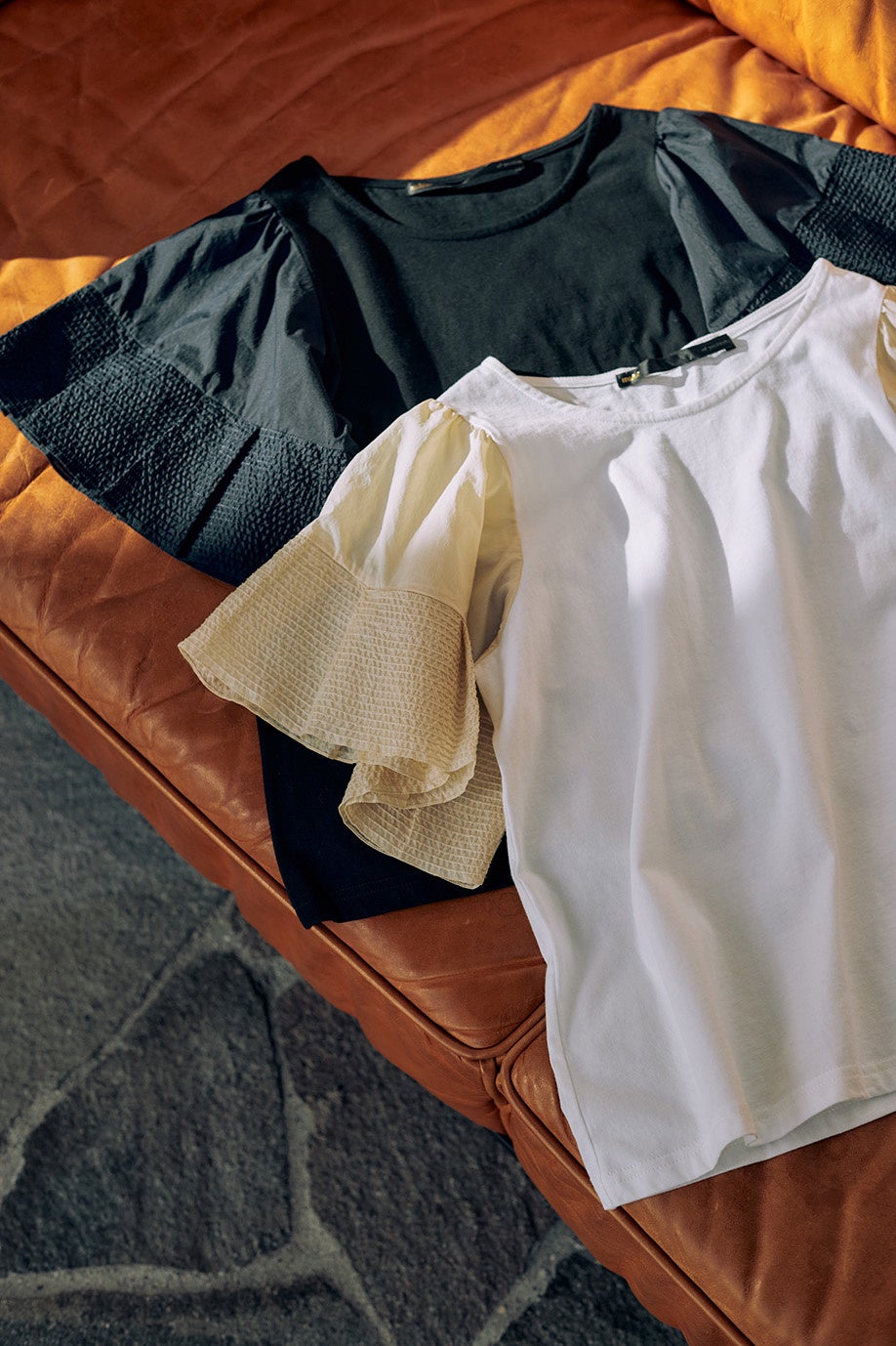 特徴であるボリュームのある袖に細かなステッチ刺繍を施すことで、生地表面の凹凸感による奥行きを持たせています。パリゴでも何シーズンも様々な素材で展開していたとても思い入れのある形。カットソーとのコンビネーションで着心地も軽やかです。