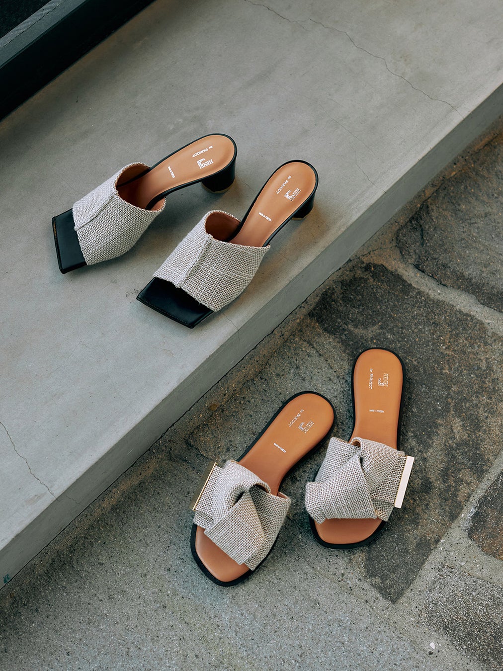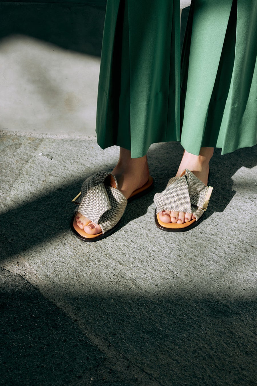 存在感たっぷりのノットデザインが目を引くフラットサンダルVeronica。ナチュラルな生地の質感にメタルパーツが映える主役級のサンダルです。底面をソフトにし、リラックスムード漂うコーディネートに合わせていただけるような履き心地にしています。