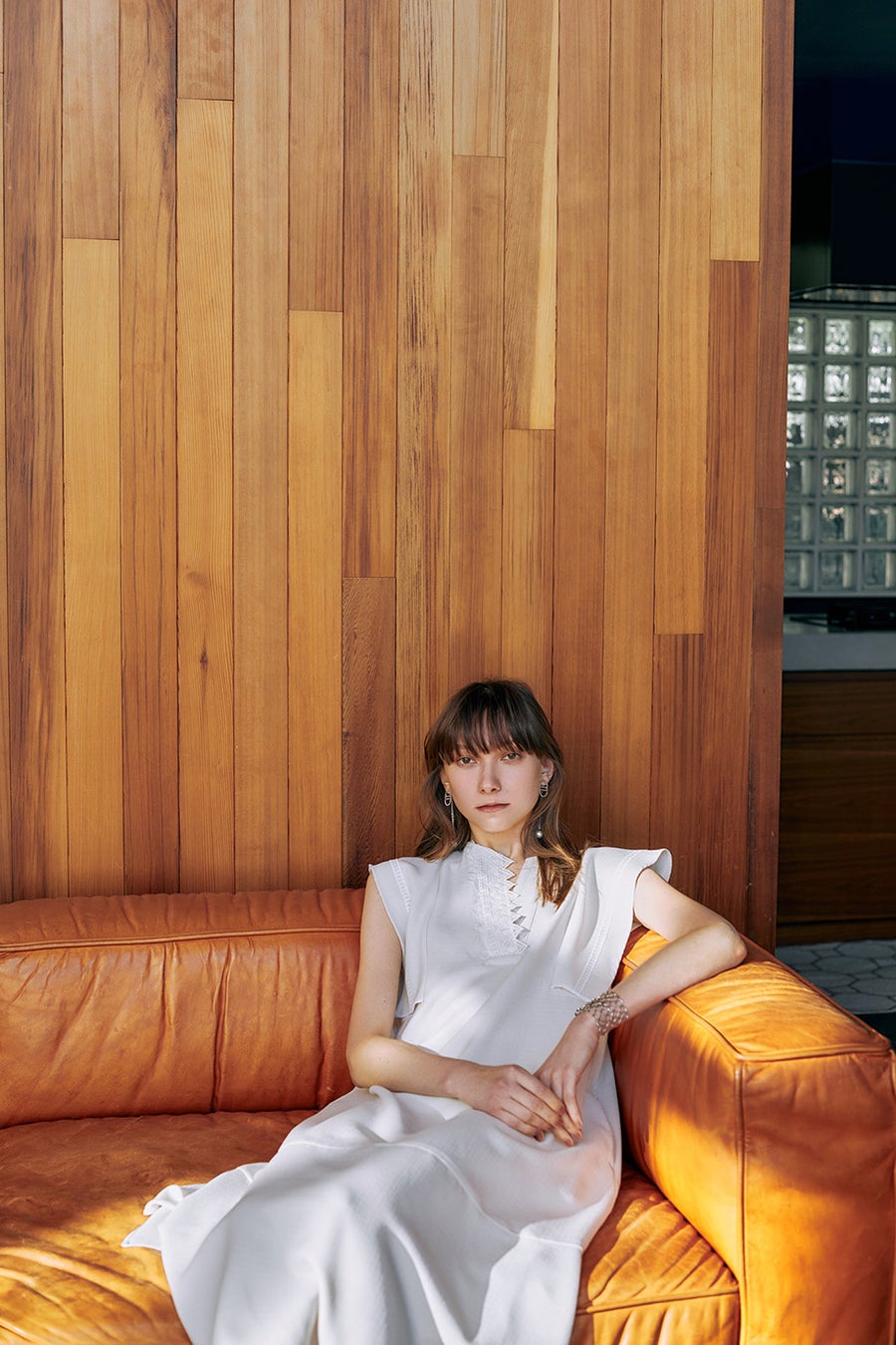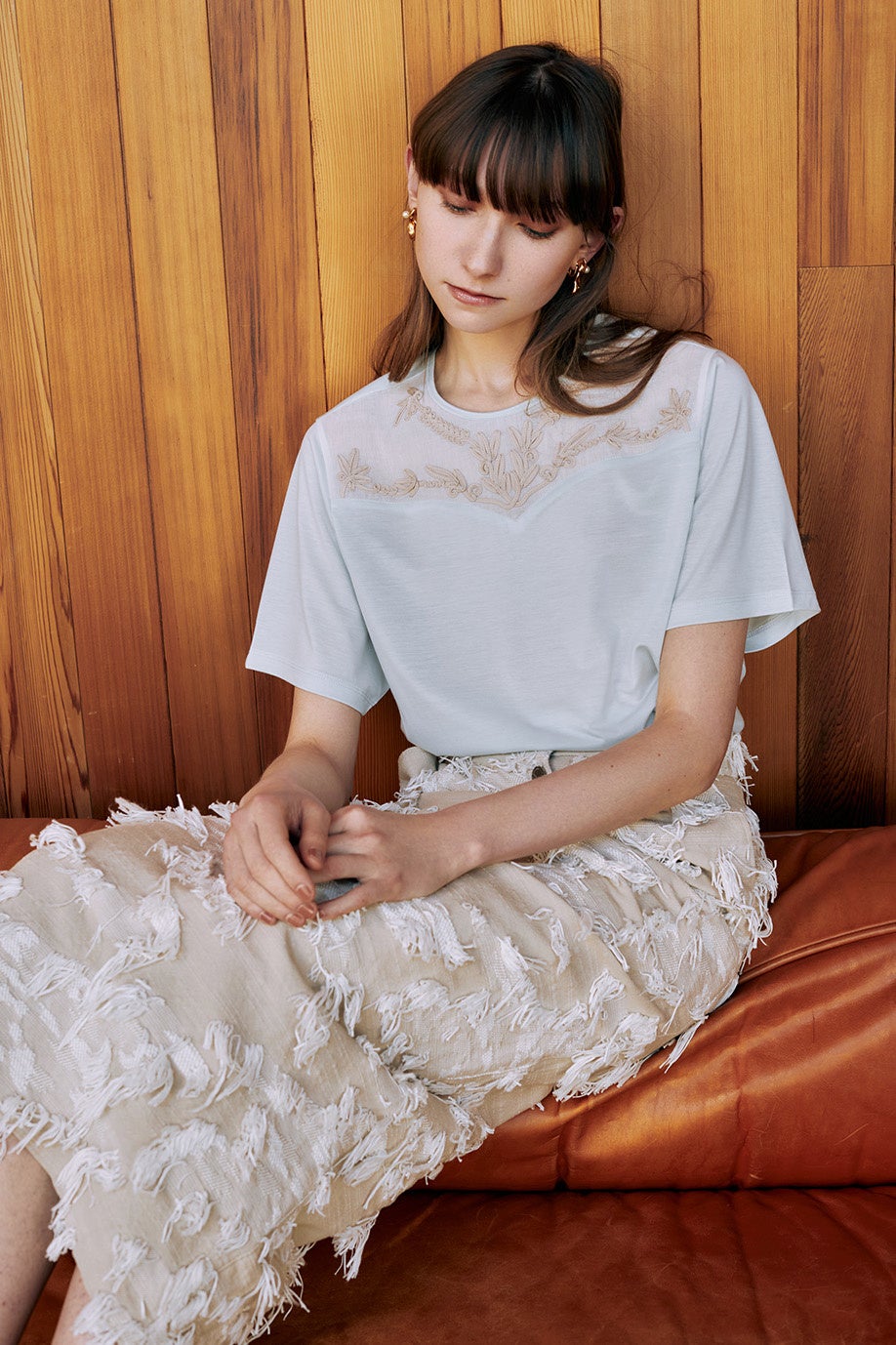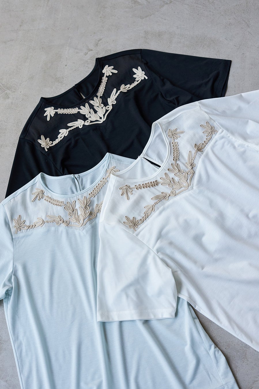落ち感と清涼感のある編地をベースに、胸元で切り替えた部分にコード刺繍を施したデザインが印象的な1枚。コード刺繍の分量や、生地感、透け感など、重くなりすぎないように全体のバランスを考え抜いてデザインされています。