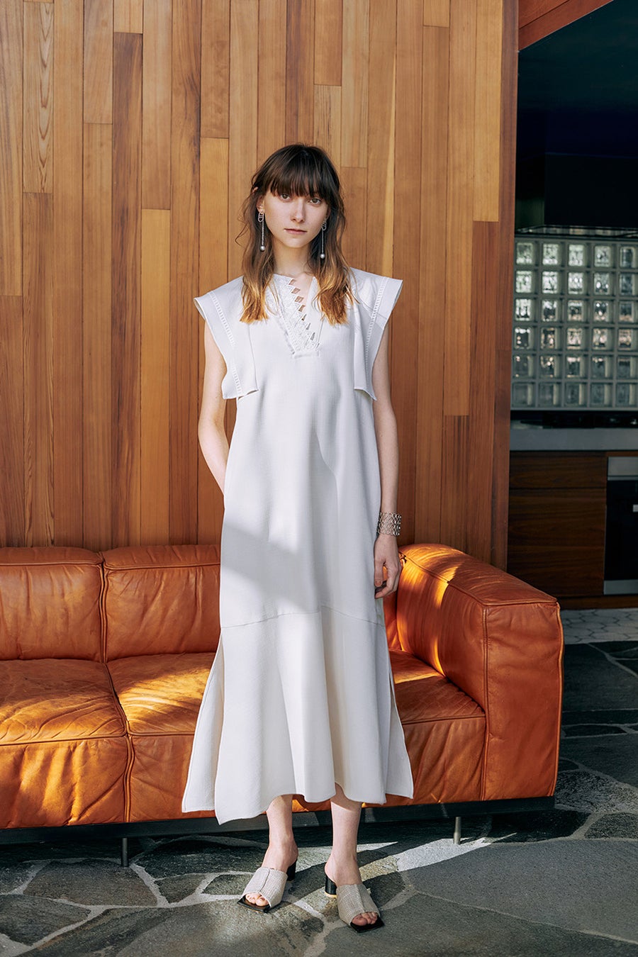シーズンモチーフのボタニカルレースをデザインパーツとして用いたコントラストワンピース。クリスピータッチなブッチャー素材が夏らしい表情感で、スクエアスリーブとミッドカーフ丈がNEWバランスな1枚となっております。