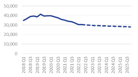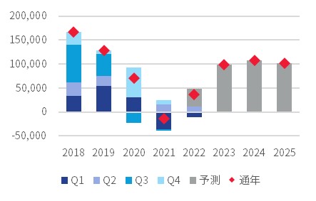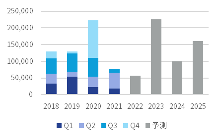 2022年のグレードAオフィスの新規供給は、概ね2022年後半以降に竣工が予定されています。また、2023年には大規模な再開発プロジェクトの竣工が複数予定され、過去5年で最も新規供給の多かった2020年に匹敵する新規供給量になることが予想されます。また、グレードAオフィスのネットアブソープション※2は長期的には回復を予想しますが、全体的なオフィス面積の縮小傾向から、2019年以前の水準よりは弱含む見込みです。