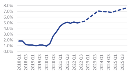 東京主要5区のグレードAオフィスビルでは、空室率の上昇には一服感がみられ、横ばい傾向が続いています。需要は回復傾向にありますが、空室率を低下傾向に反転させるほどの力強さはみられず、オフィス面積の縮小傾向から、今後も2019年以前の水準よりは弱含みになる見込みです。