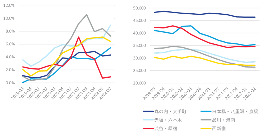 空室率の上昇は一服し、横ばい傾向にありましたが、再度上昇に転じるマーケットもみられました。賃料は下げ止まり傾向にありますが、大きな空室を抱える物件では、依然として大幅な賃料のディスカウントがなされる事例もみられます。