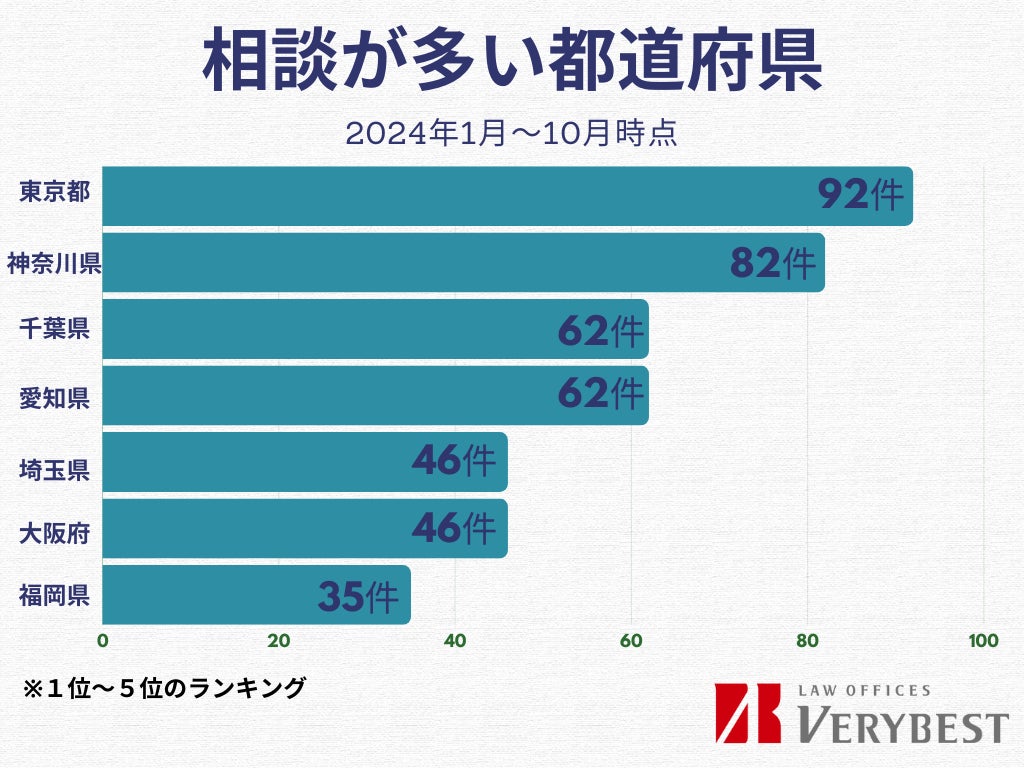 都道府県別での相談数は、東京都92件、神奈川県82件をはじめとする首都圏での相談が多いことが明らかになりました。