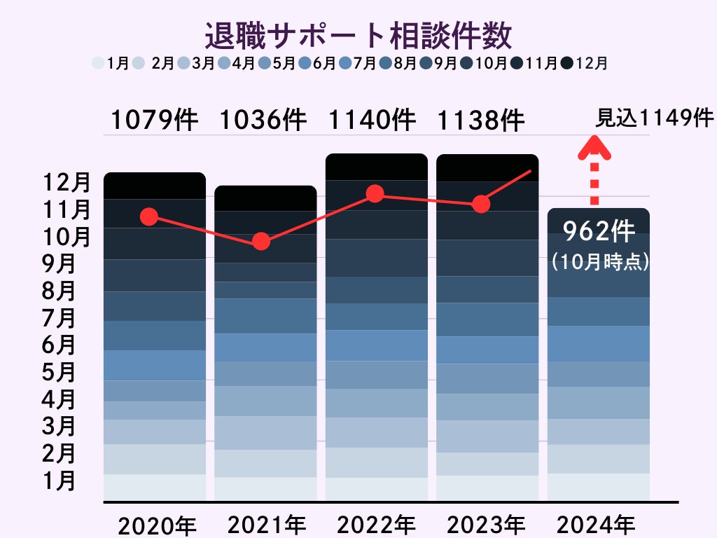 調査によると、退職サポートに関する相談件数はここ数年間、多少の増減が見られるものの、大幅な変動はなく、2020年~2024年にかけて一定の水準を維持しています。2020年に1079件、2021年に1036件、2022年には1140件、2023年は1138件と、年間を通じてほぼ横ばいで推移しており、2024年は年末までに1149件に達する見込みです。